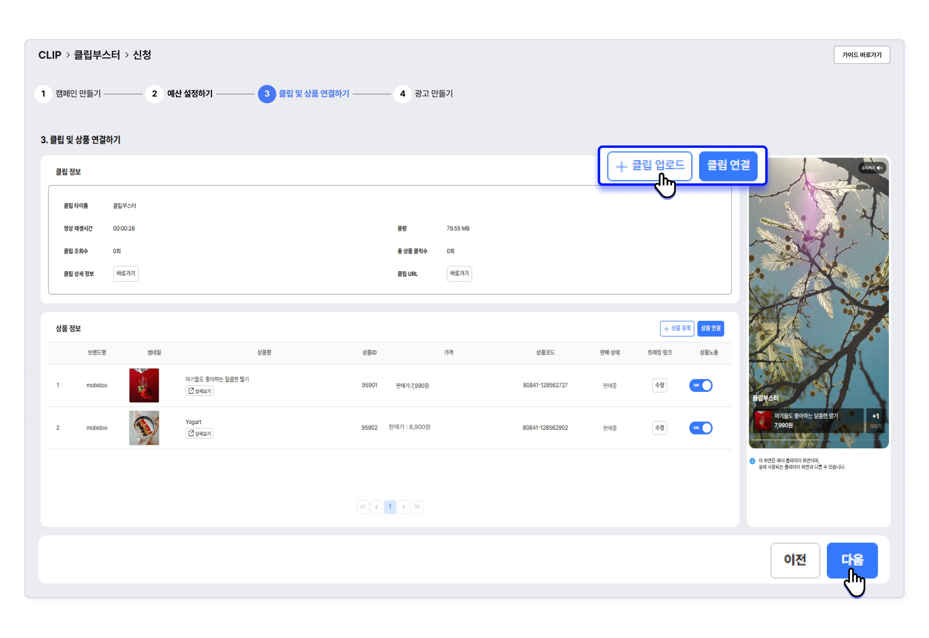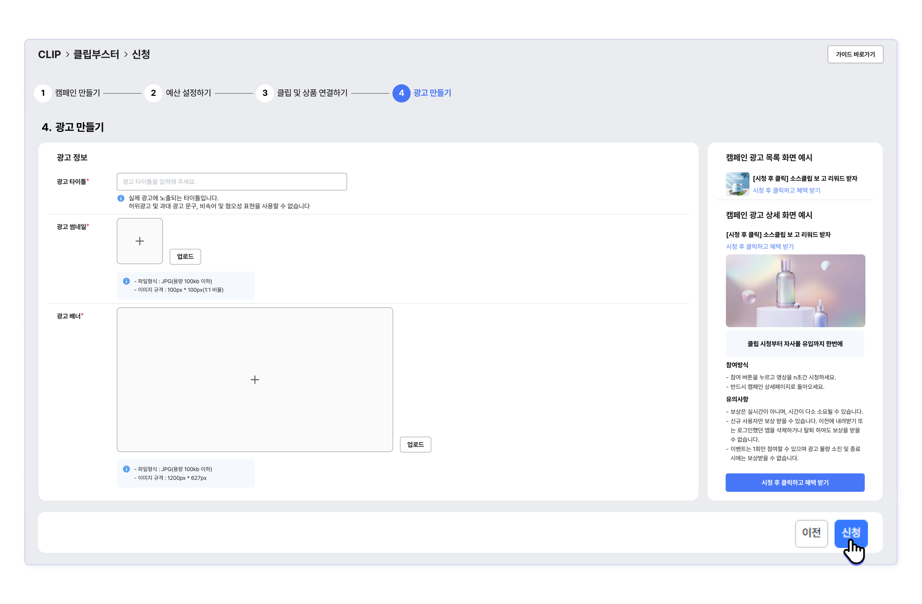 캠페인 만들기, 예산 설정하기, 클립 및 상품 연결하기, 광고 만들기 총 4개 단계 화면의 정보를 모두 작성하면 캠페인 신청이 완료 됩니다. 위의 단계에 따라 캠페인을 신청해보세요.