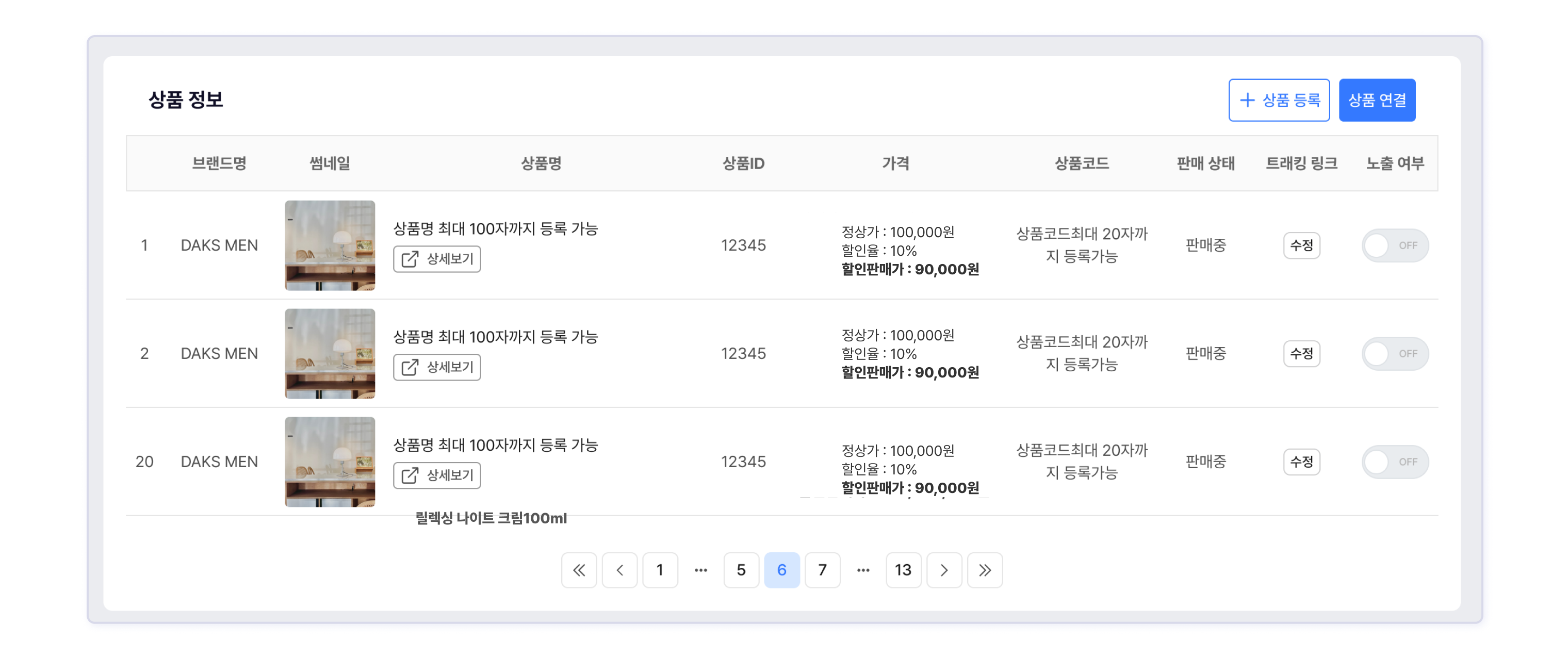 - 상품 등록 : 새로운 상품을 현재 페이지에서 등록합니다. 클릭 시, 상품 등록 팝업이 노출됩니다.