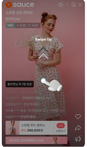 VOD콘텐츠를 쇼룸 기능을 사용해 노출하고 있는 경우, 시청자는 VOD 콘텐츠를 스와이프해 다음 VOD 콘텐츠로 이동할 수 있습니다.
