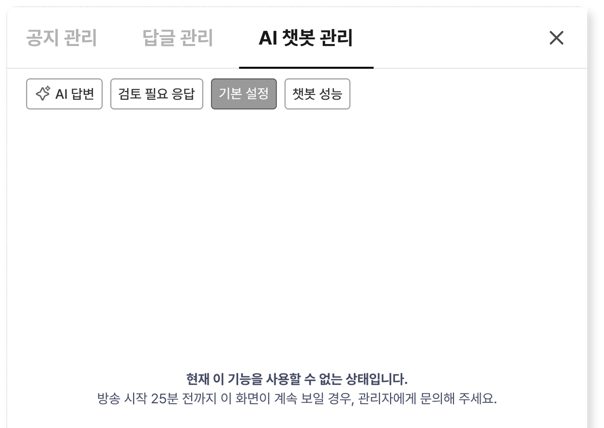 AI 챗봇 관리 > 기본 설정 항목은 AI 학습 데이터가 정상적으로 설정된 경우에 활성화됩니다.