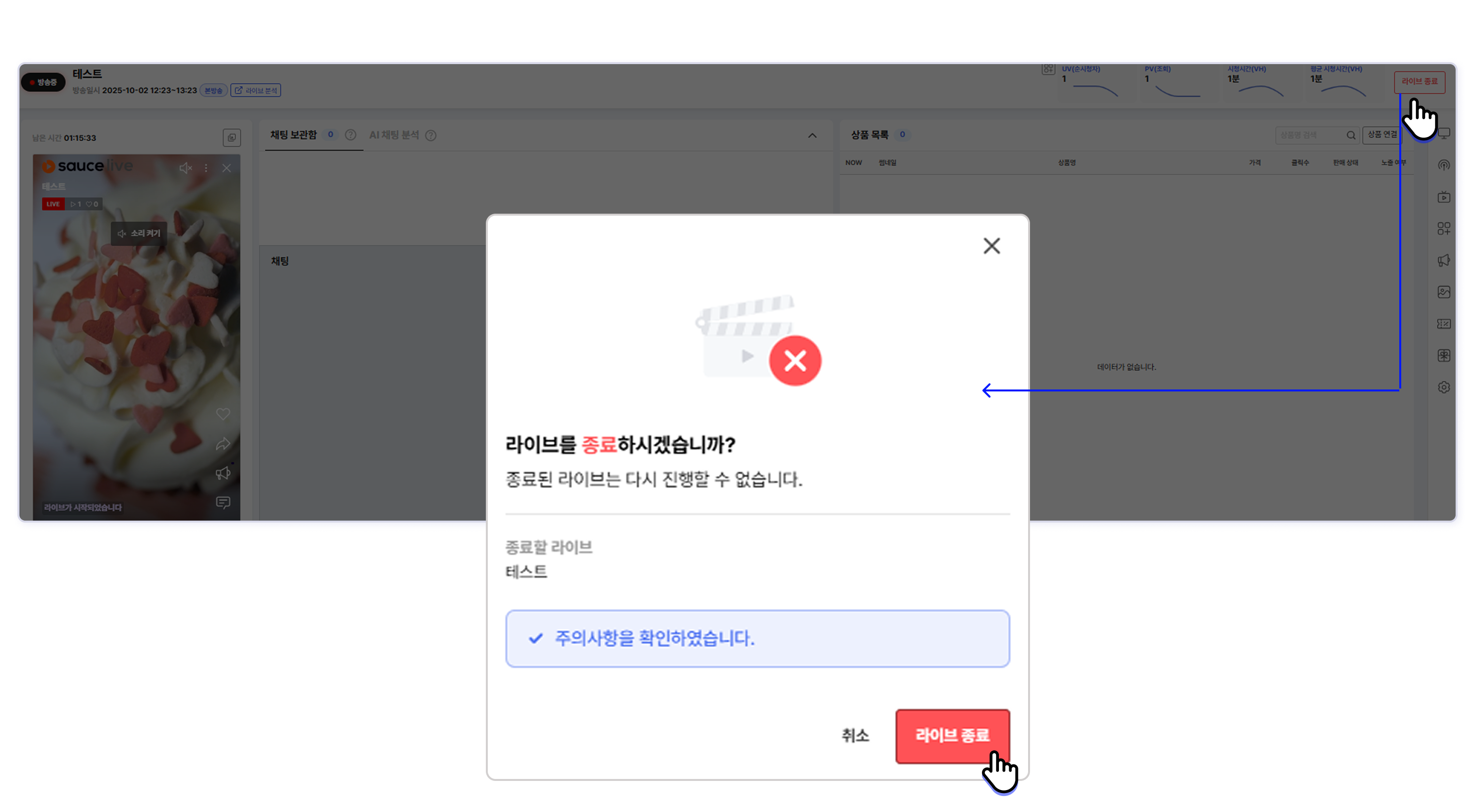 STEP 2. 확인 팝업에서 ‘주의사항을 확인했습니다’에 체크한 후 라이브 종료를 클릭합니다.