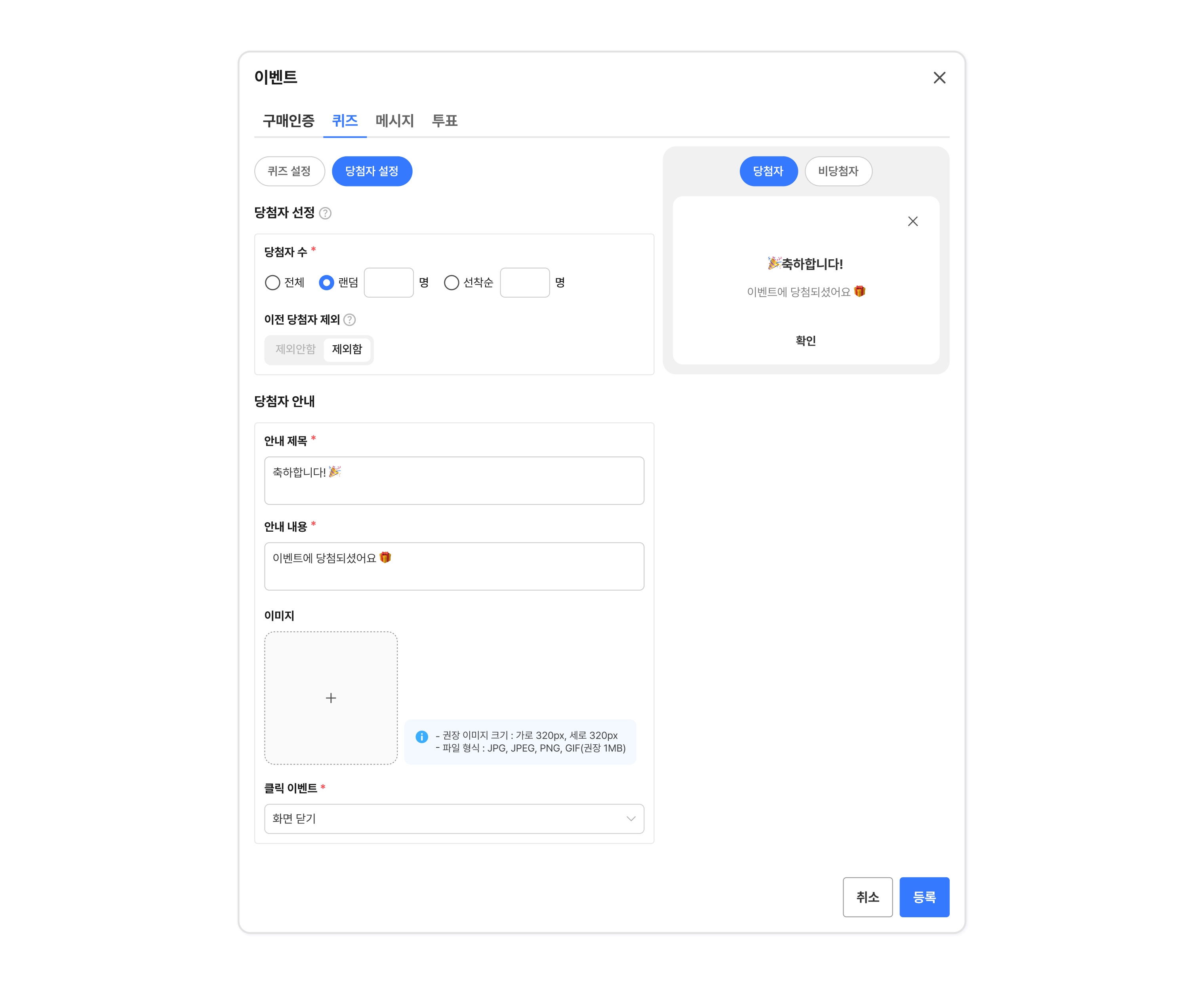 당첨자 설정 - 구매인증, 메시지, 퀴즈, 투표