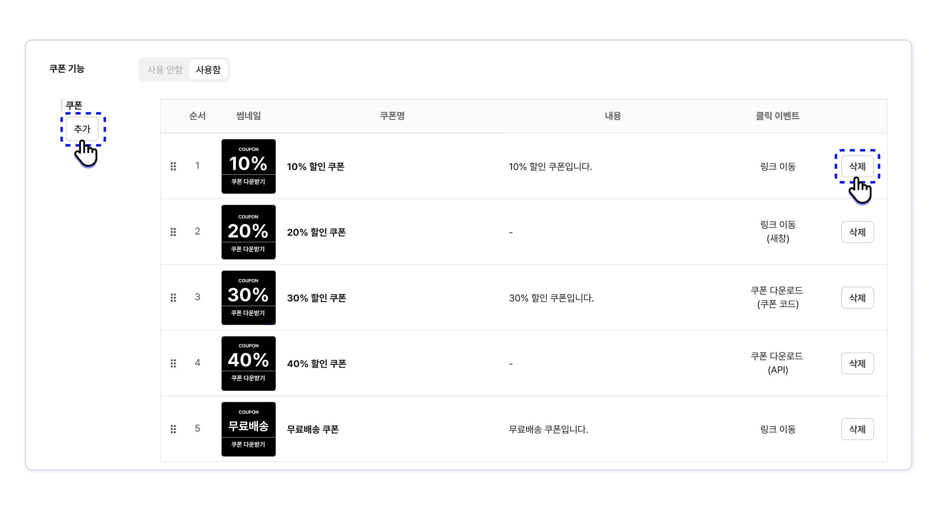 수정 또는 삭제 버튼을 클릭해 쿠폰을 관리합니다.