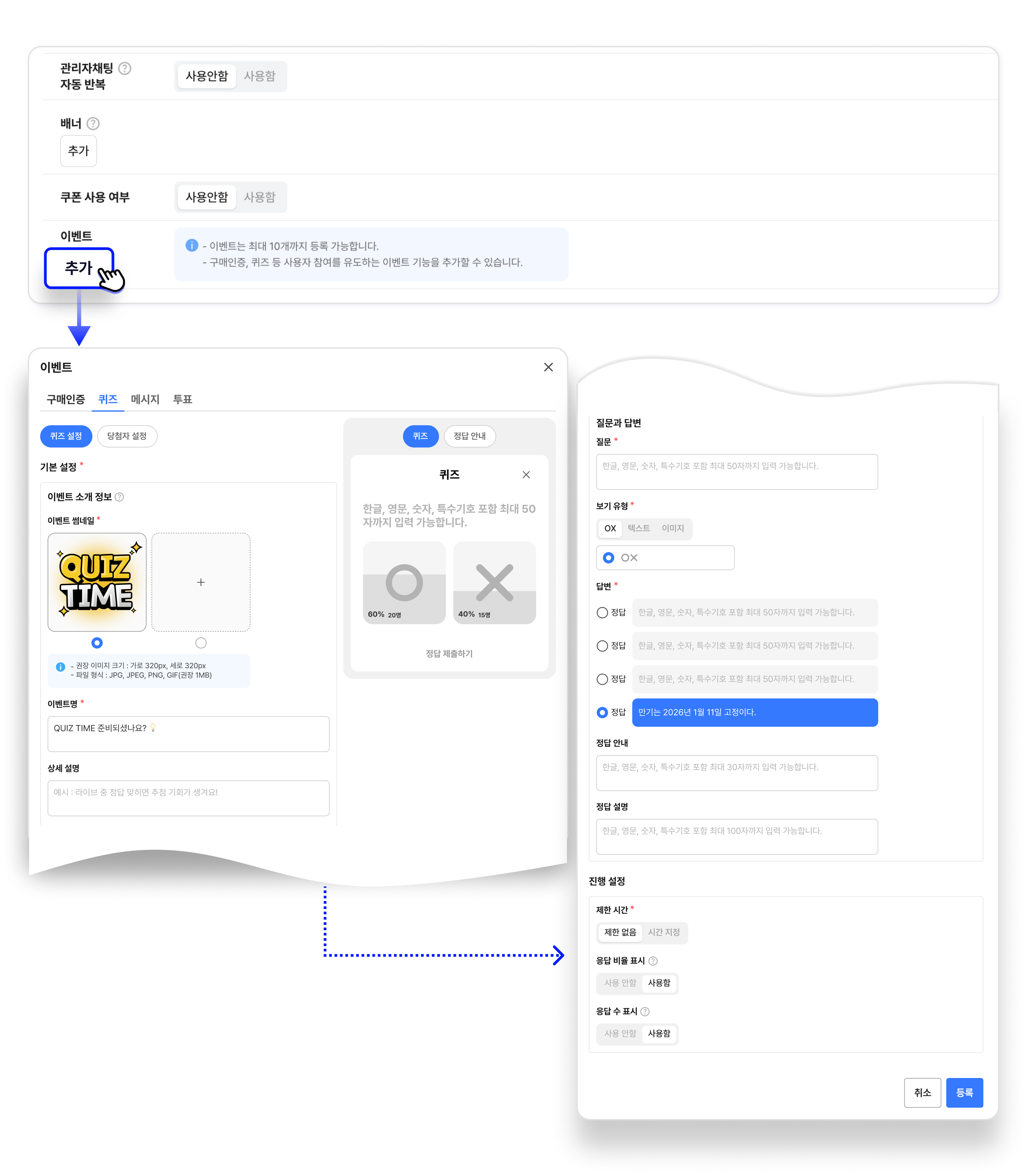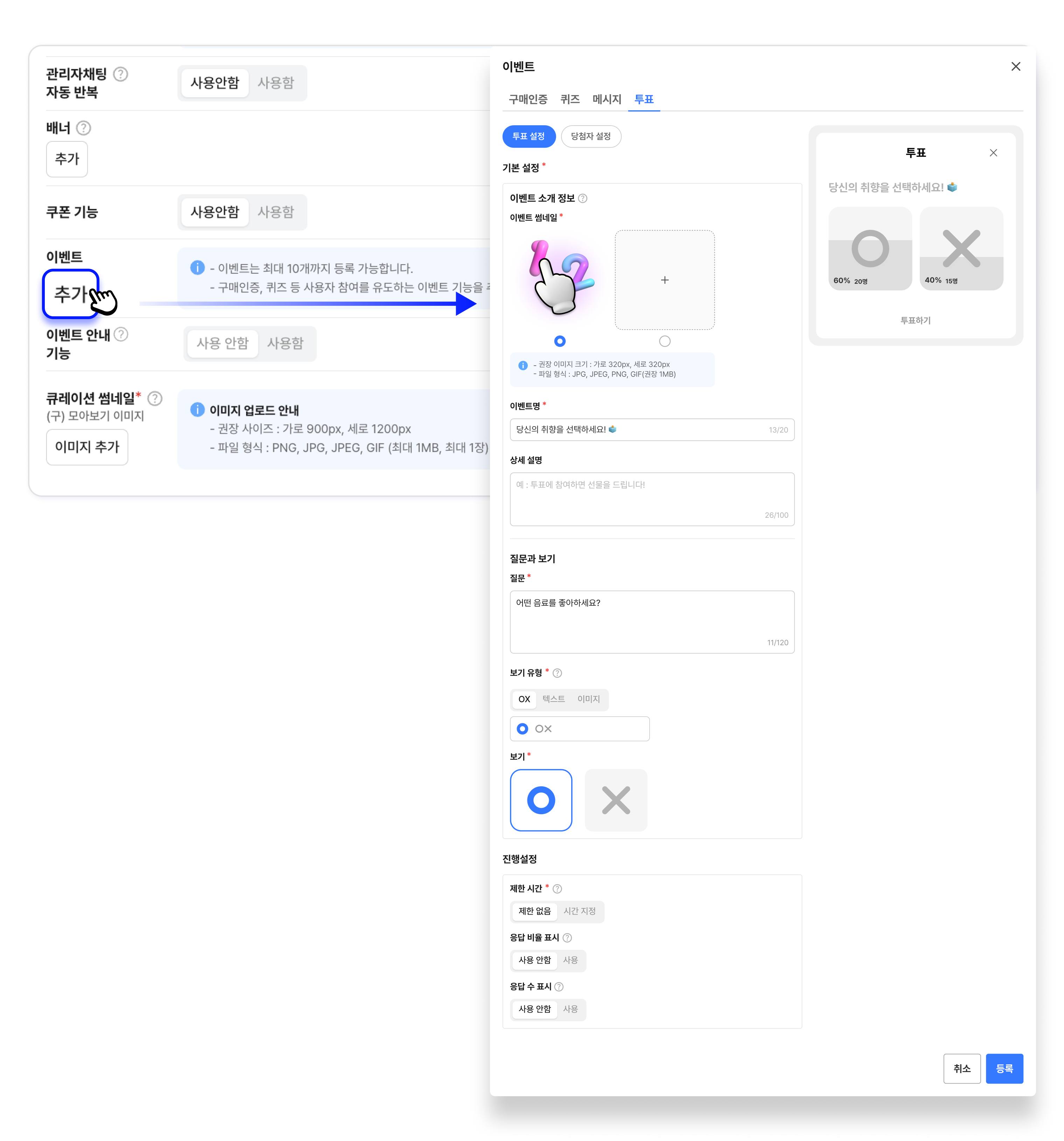 투표 이벤트는 퀴즈 이벤트와 설정 방법이 동일하며, 정답 설정 부분만 생략되었습니다.