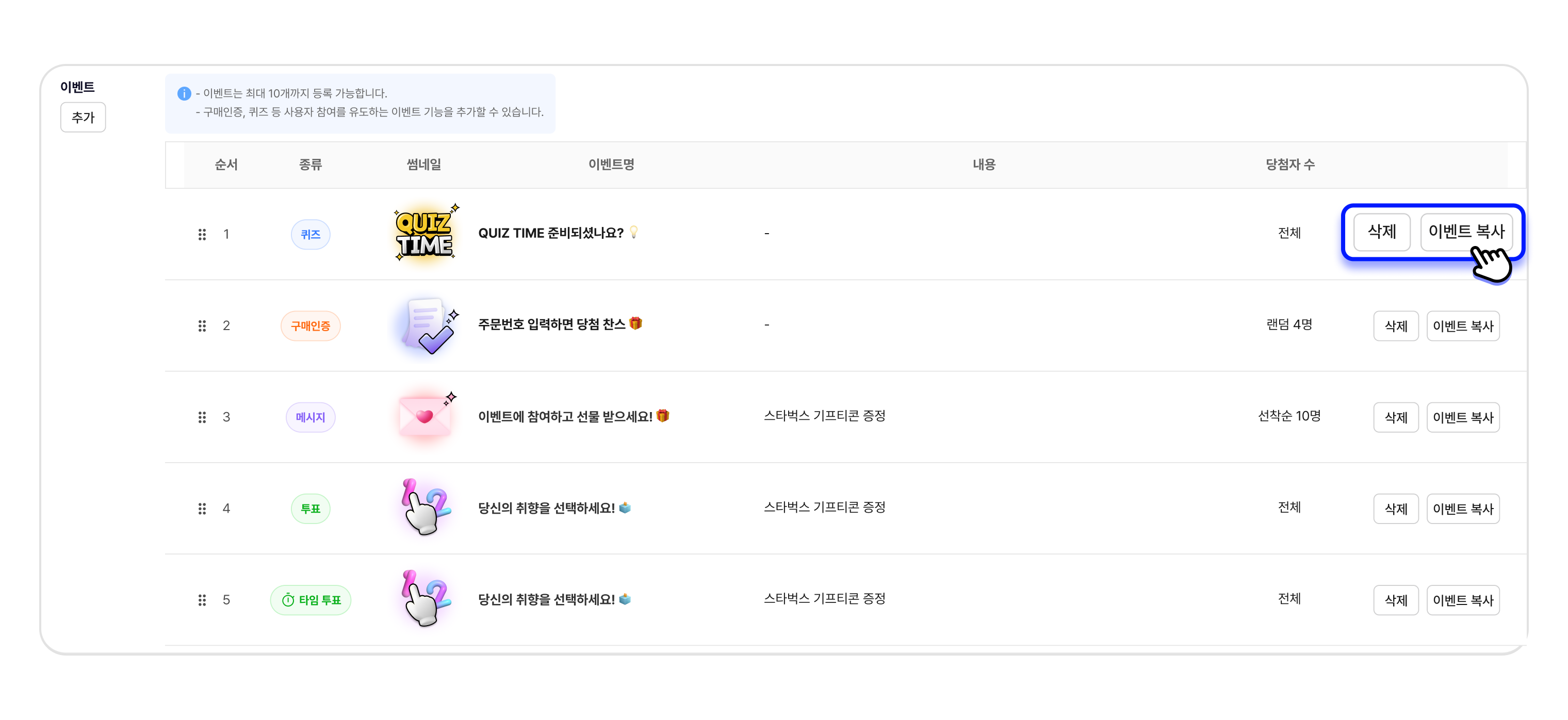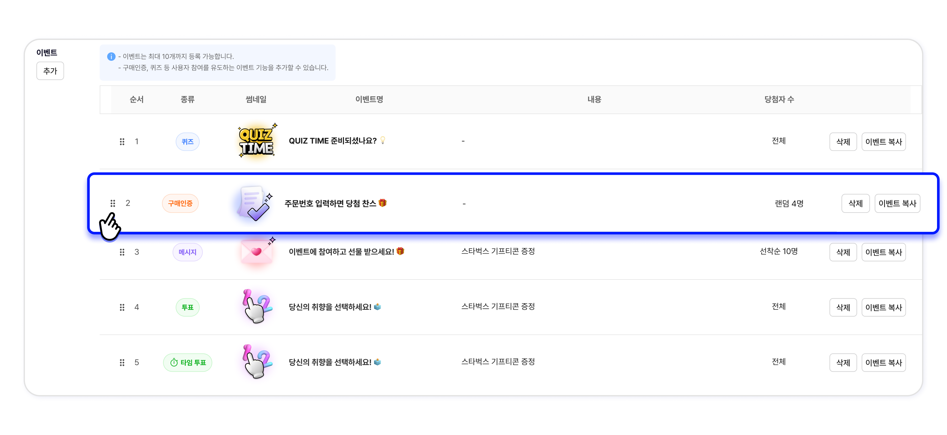 이벤트는 최대 10개까 등록 가능합니다.