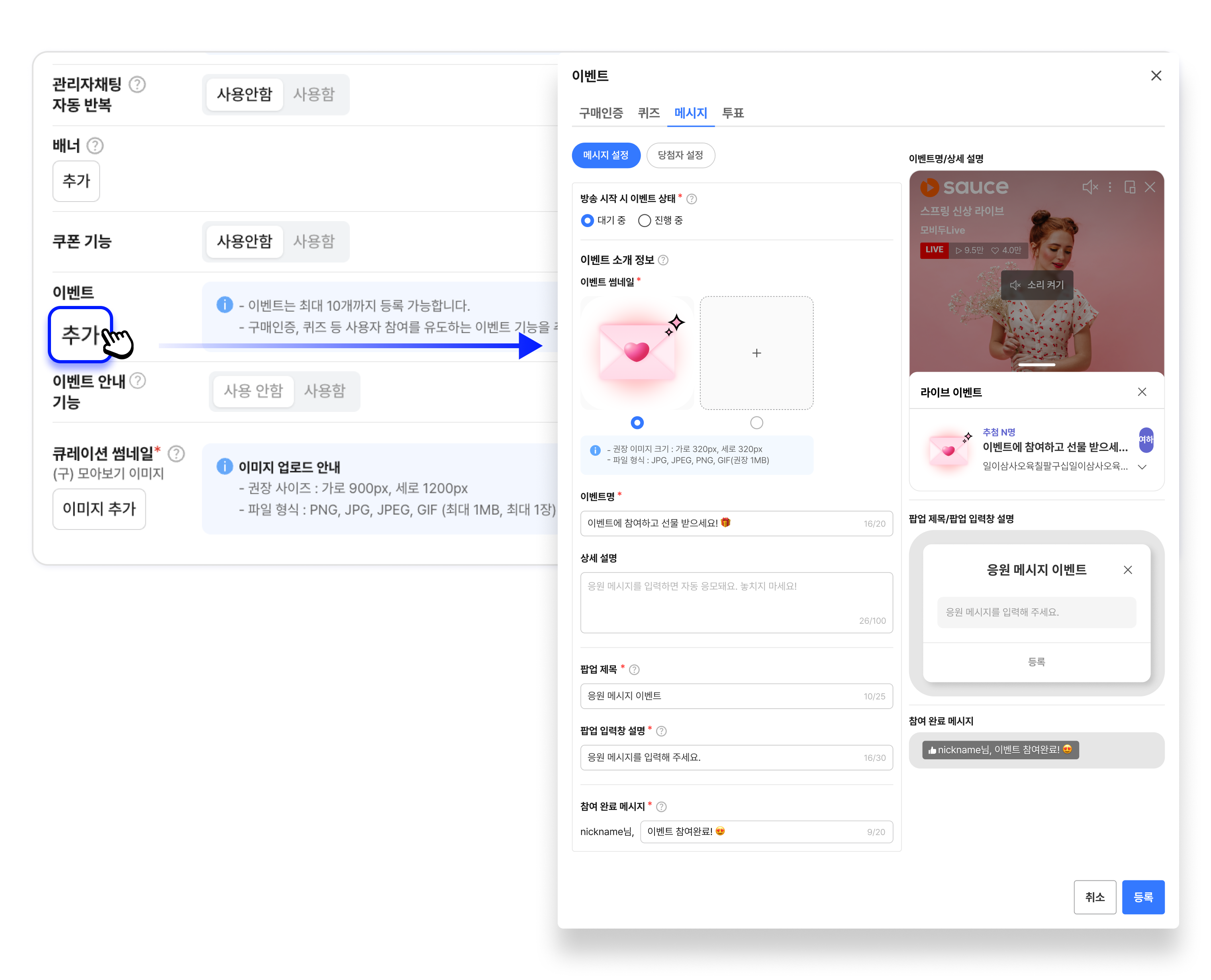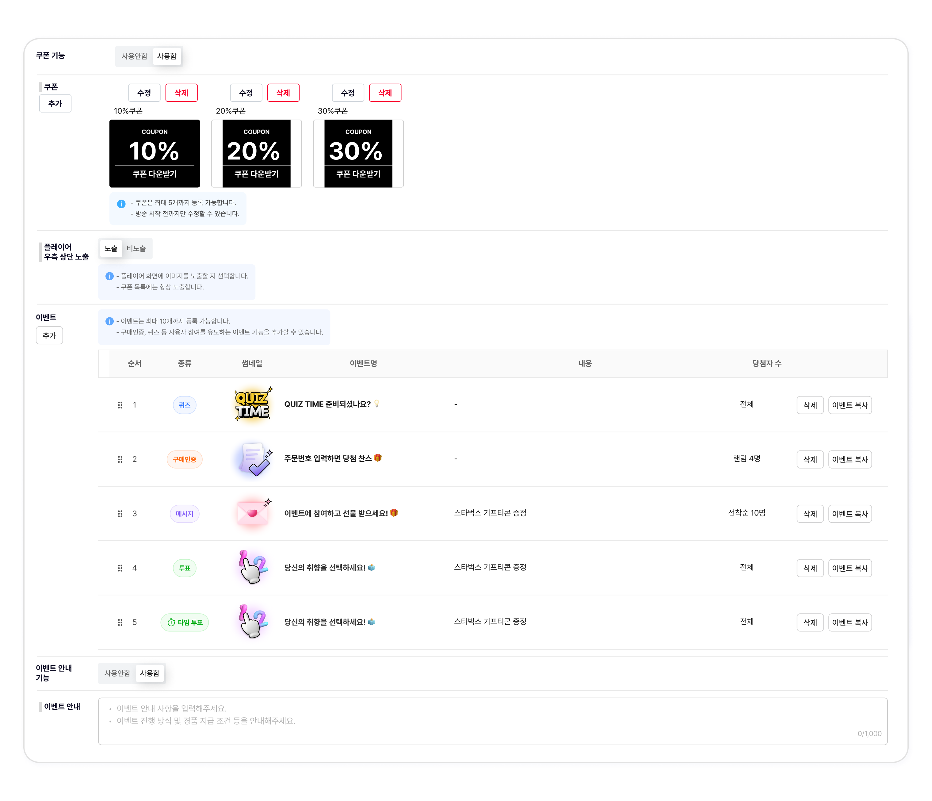 라이브 진행 중 시청자 소통 및 참여를 위한 쿠폰과 이벤트 기능(구매인증, 메시지, 퀴즈, 투표)을 구성할 수 있습니다.