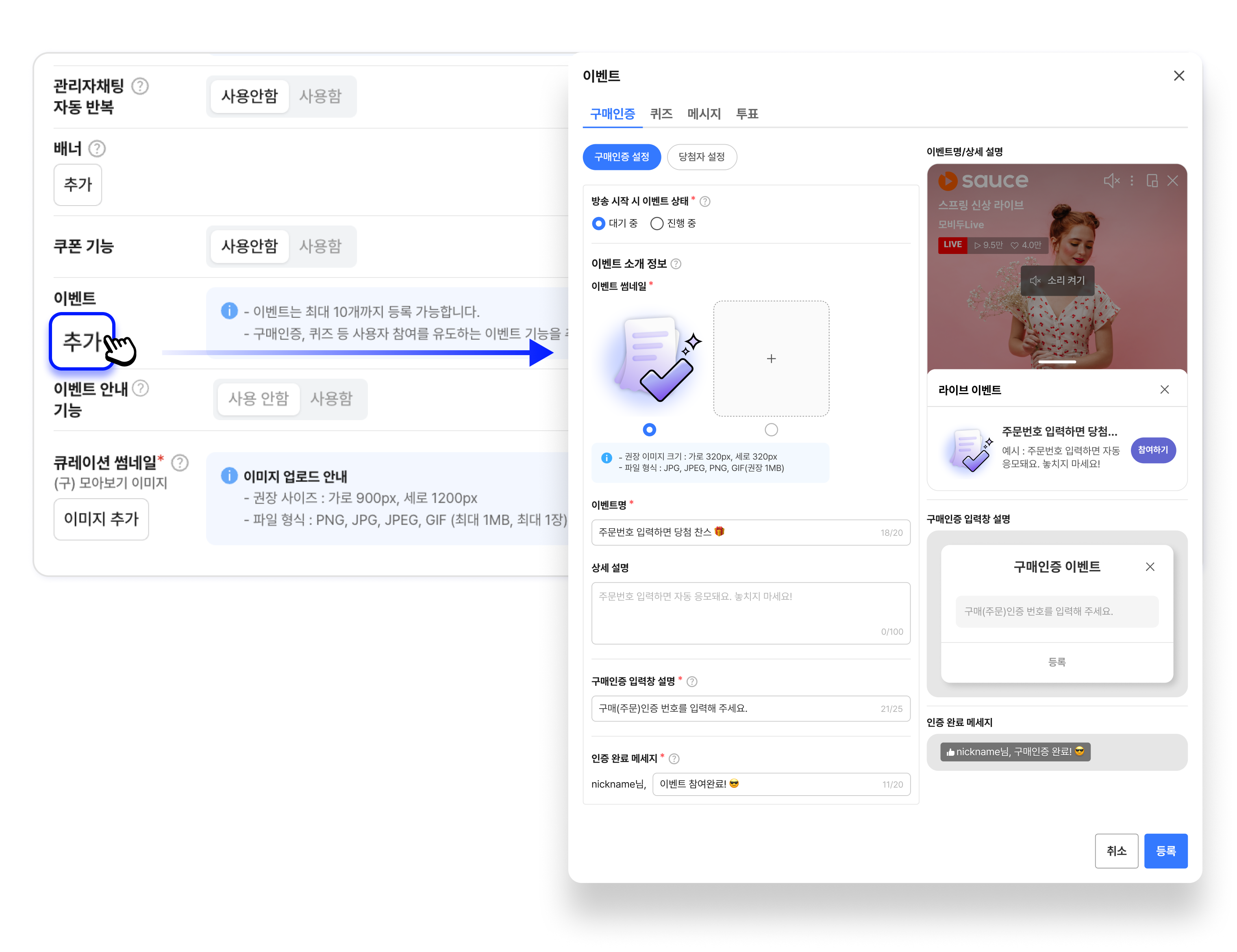 미리보기 영역에서 라이브 이벤트 목록과 구매인증 입력창, 인증 완료 메시지를 미리 볼 수 있습니다.