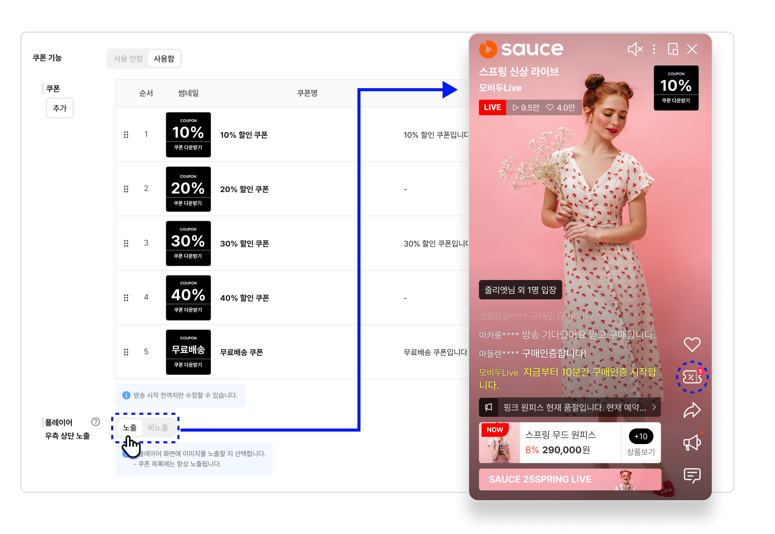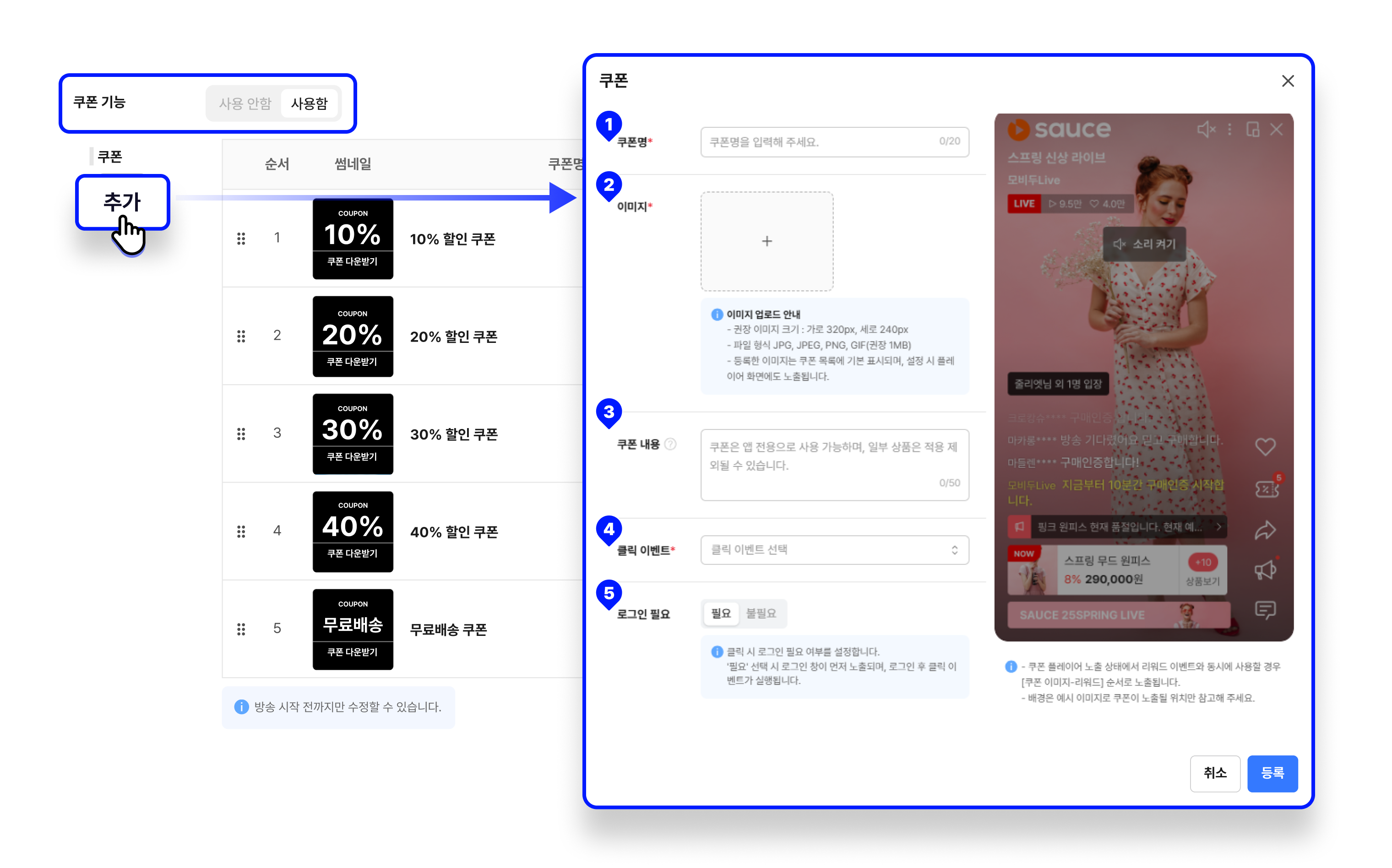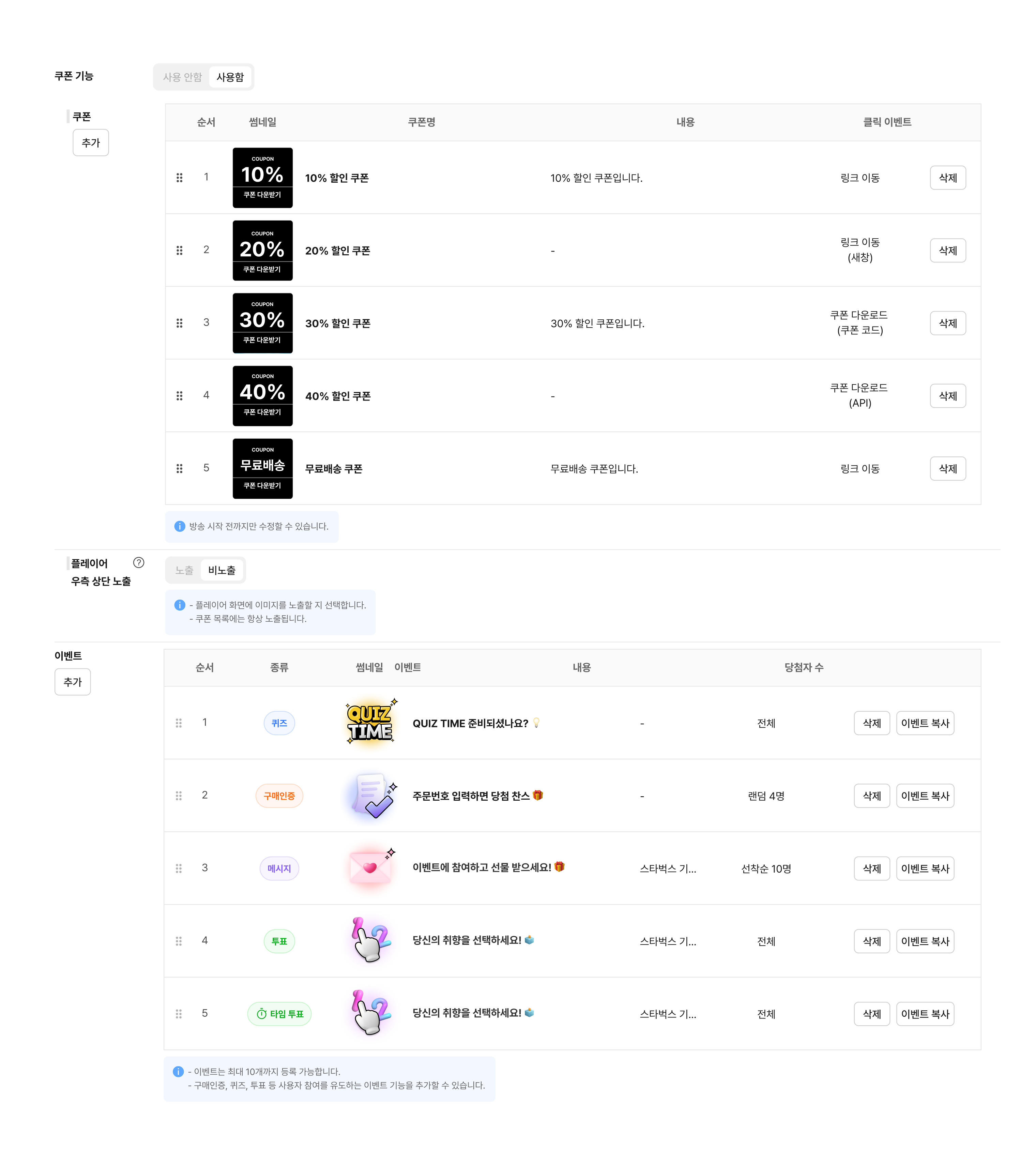 라이브 진행 중 시청자 소통 및 참여를 위한 쿠폰과 **이벤트 기능(구매인증, 메시지, 퀴즈, 투표)**을 구성할 수 있습니다.