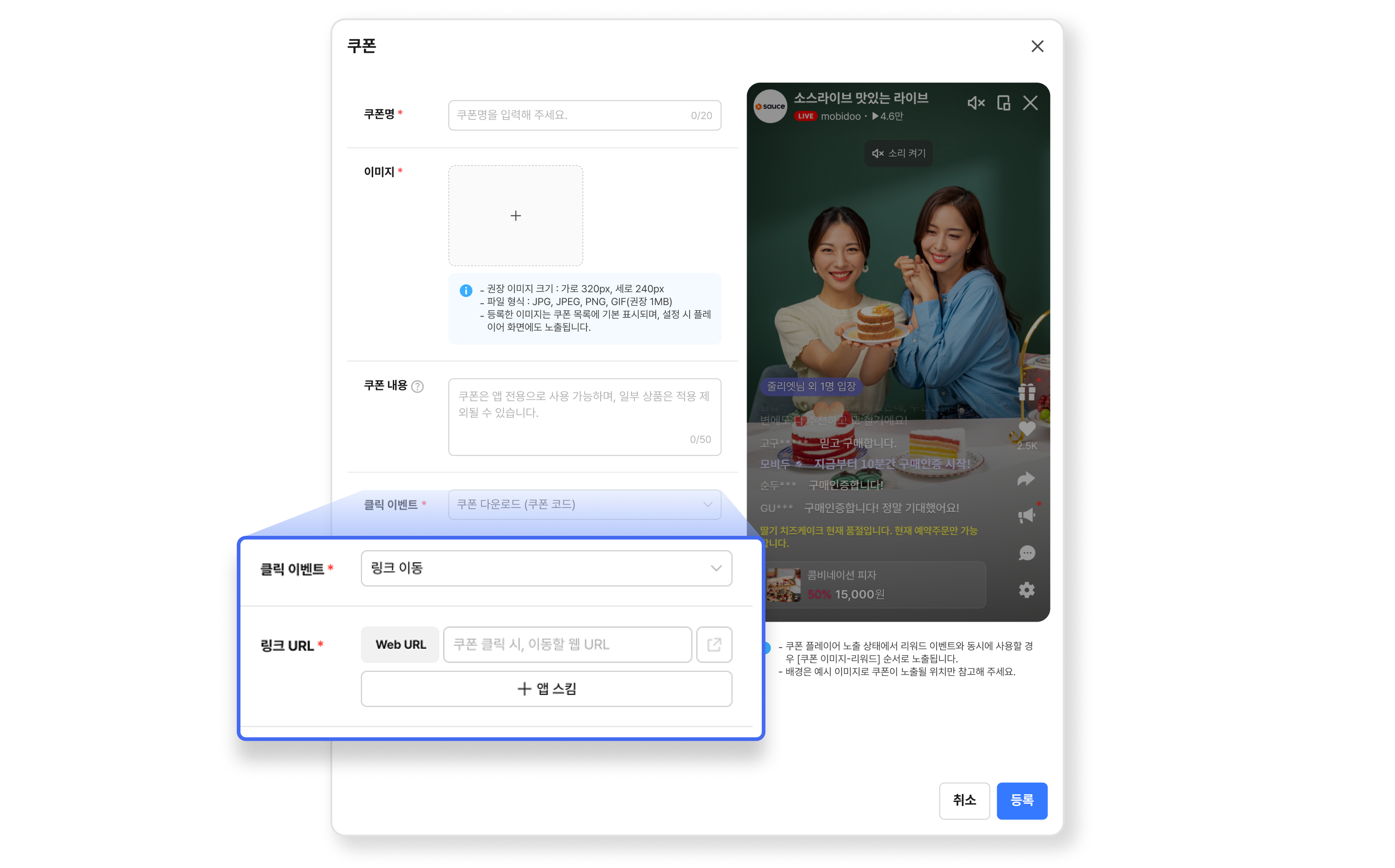 라이브 상태 쿠폰 추가 쿠폰 수정 쿠폰 노출 설정