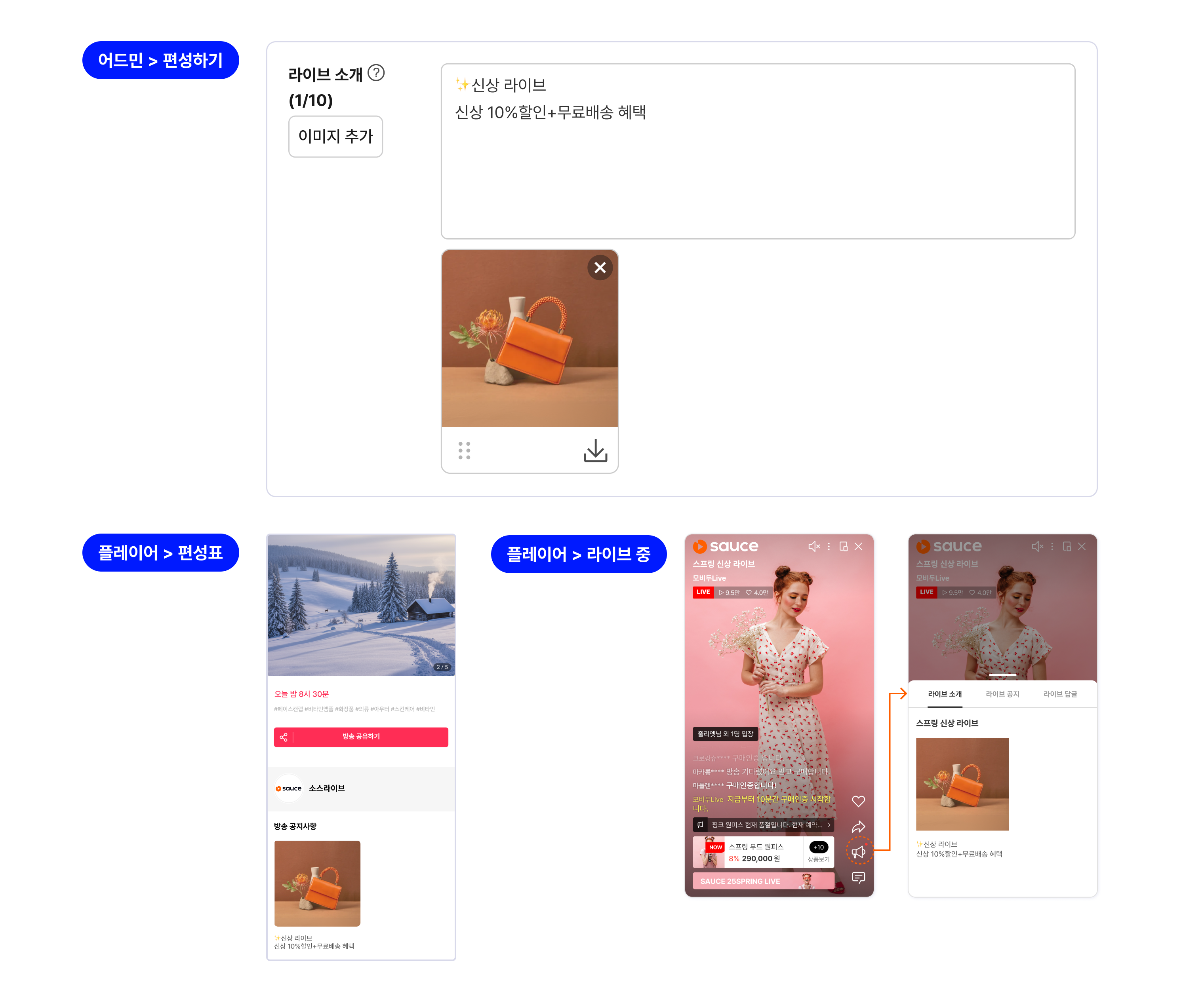 화면 구성 설정에서는 라이브 편성표에 업로드 되는 이미지, 동영상 항목 전반에 대한 설명입니다.