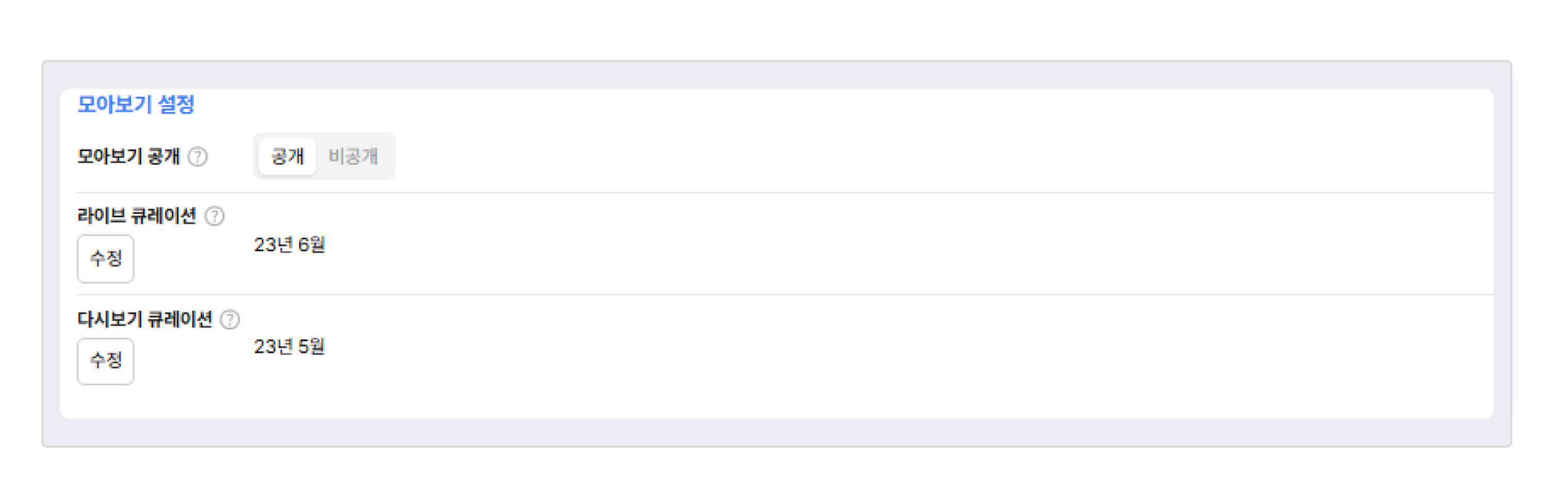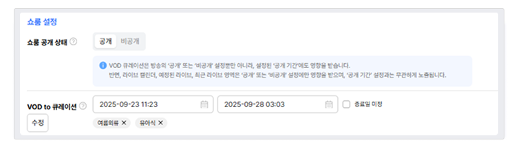 - 다시보기 큐레이션 : 라이브 종료 후, VOD로 전환된 콘텐츠를 자사몰 내 모아보기 페이지에 노출되도록 큐레이션 항목을 선택합니다.