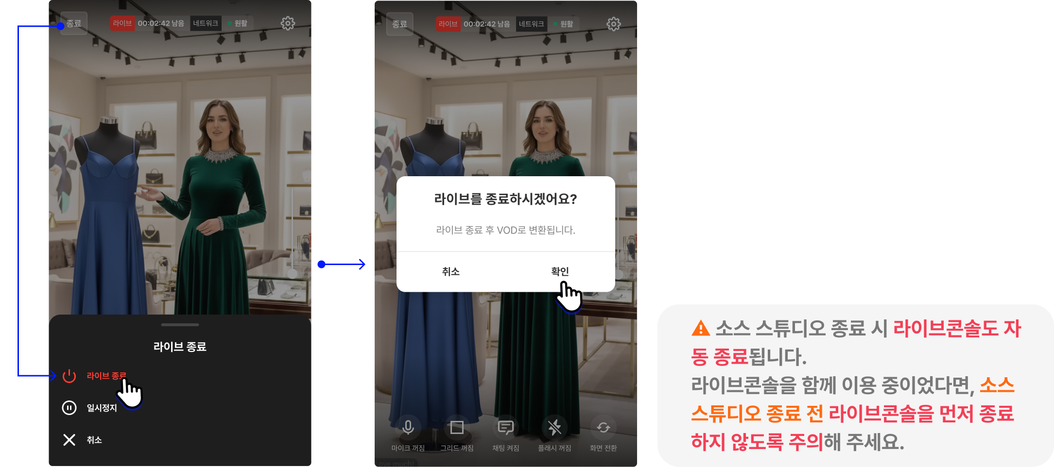 실제 송출 화면과 약간의 지연이 있으므로, 마무리 인사 후 약 10초 뒤 종료 버튼을 클릭하세요.