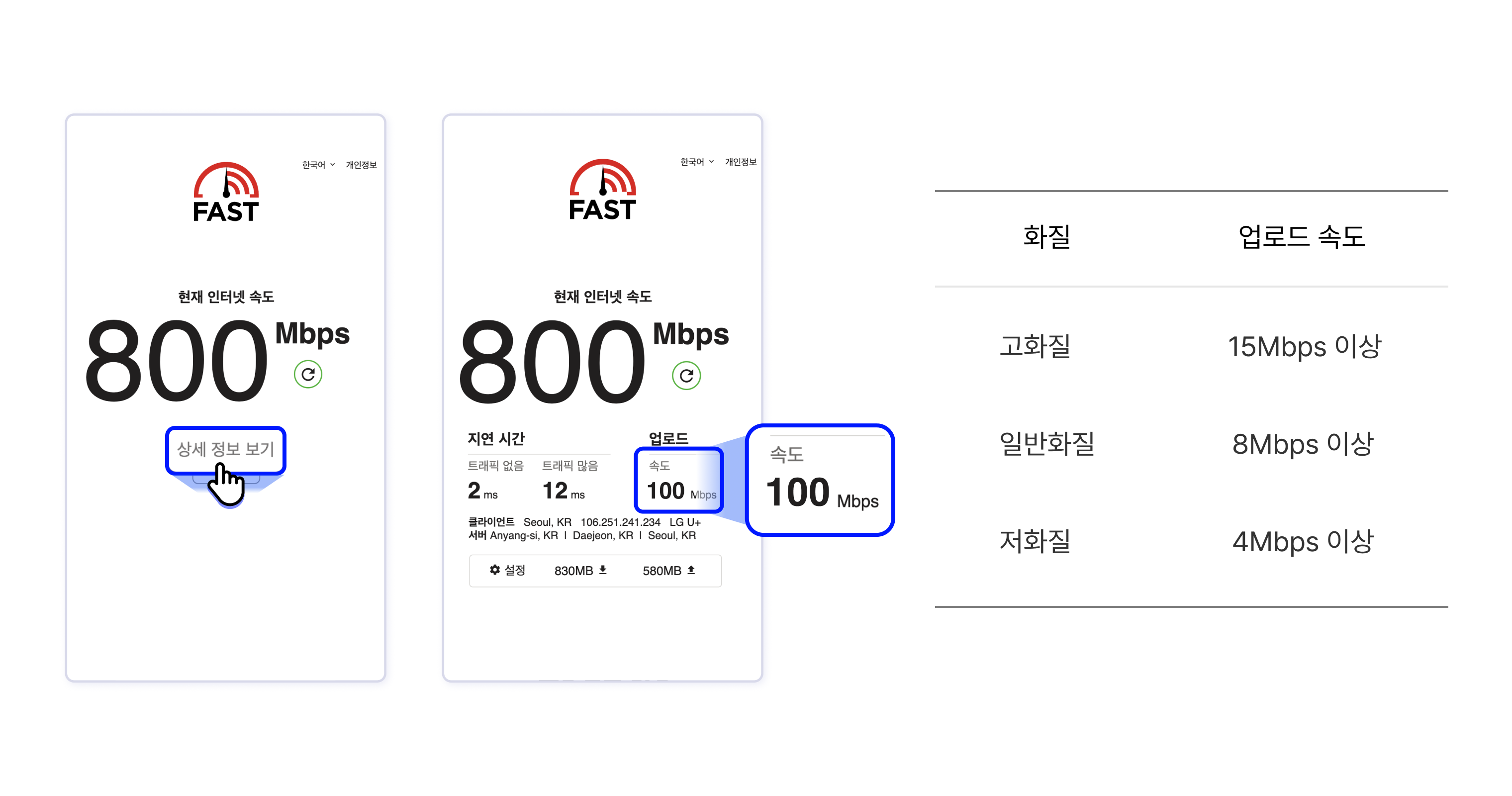 - 아래의 업로드 속도를 참고로 라이브를 진행할 화질을 선택하세요.