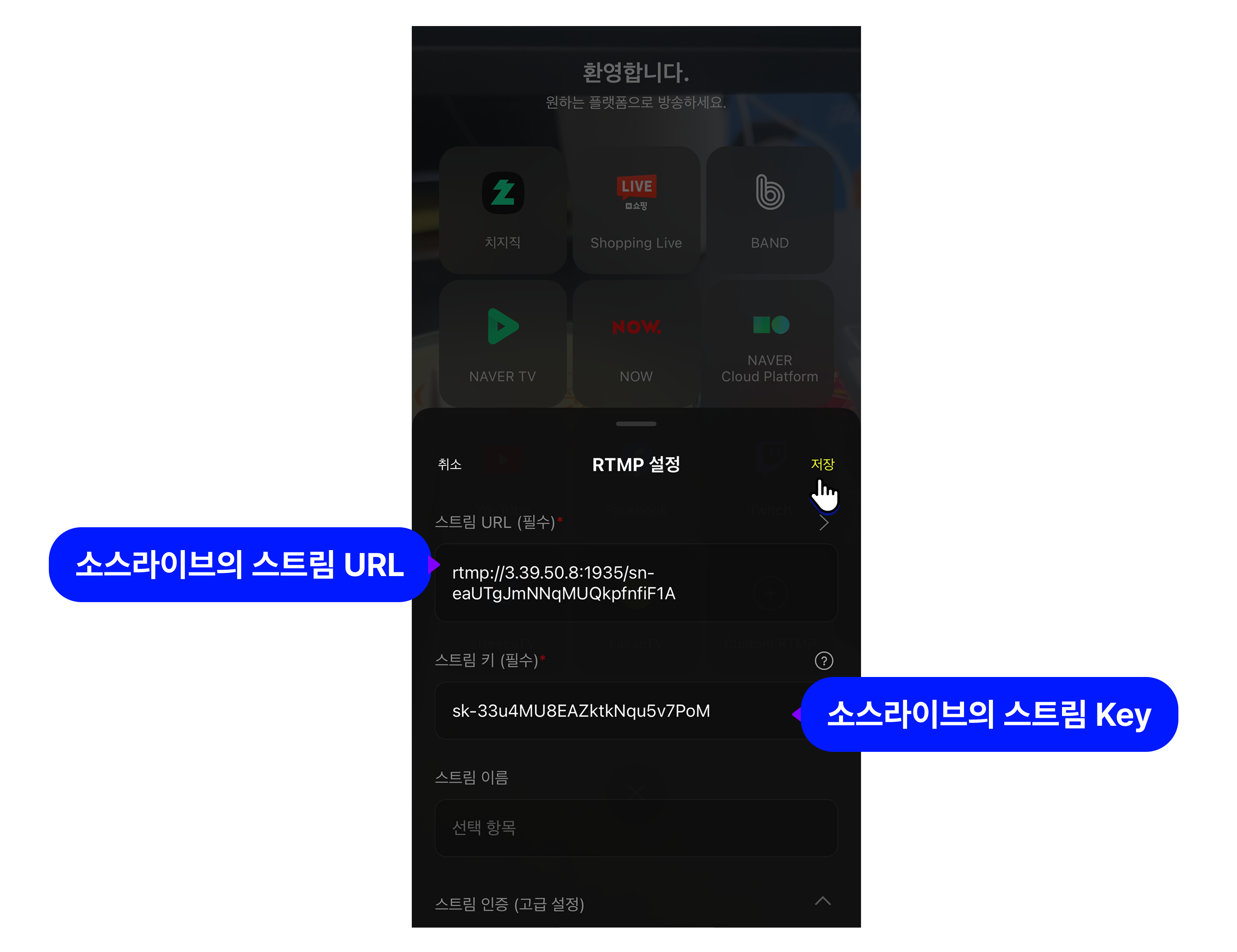 STEP 3. RTMP 설정 창에 어드민에서 확인한 스크림URL과 스트림키를 입력 후 저장을 클릭합니다.
