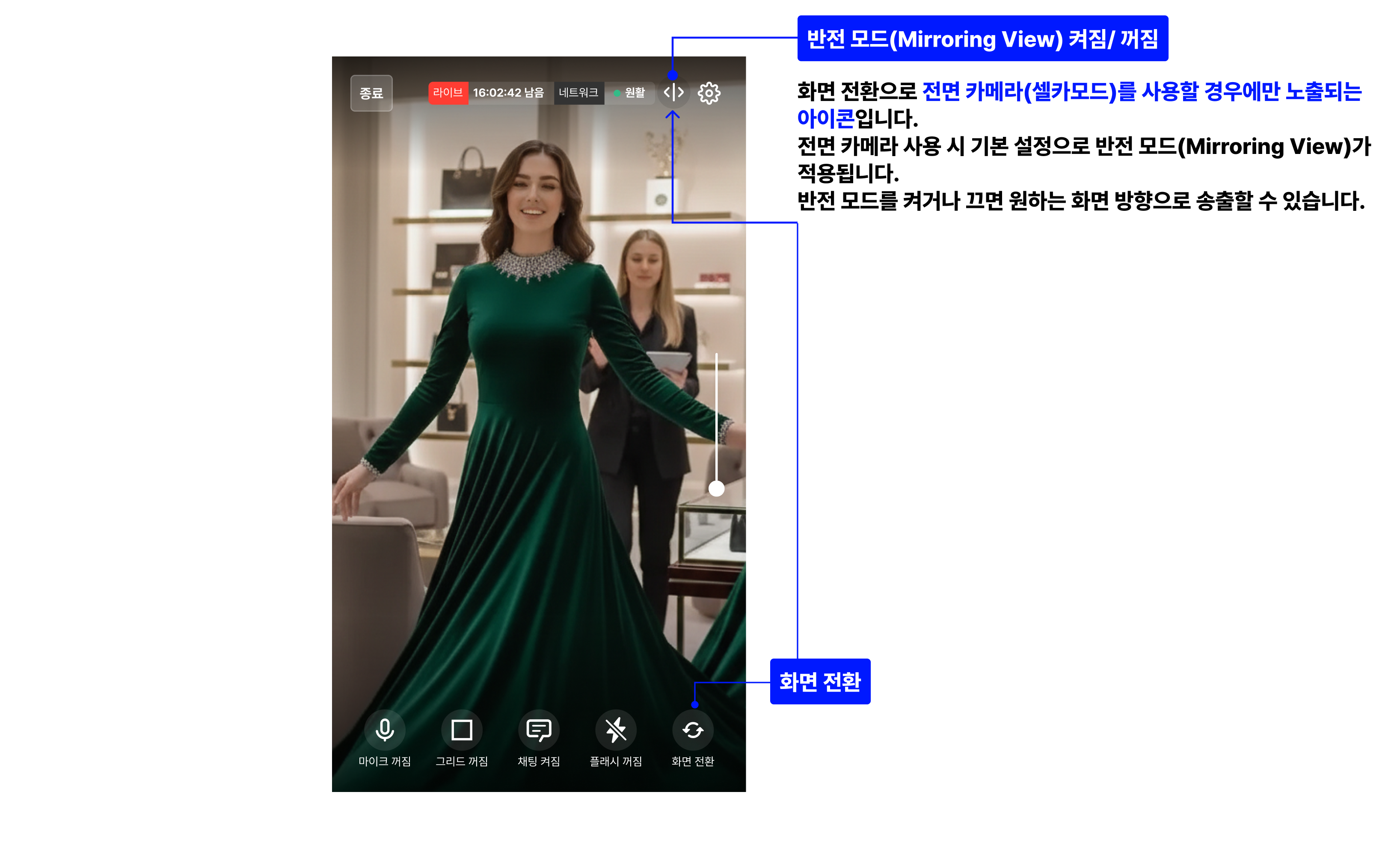 라이브 중 화면 전환 아이콘을 클릭해 전면 카메라(셀카 모드)를 사용한다면, 화면 반전(거울 모드, Mirroring View)이 필요한지 확인해보세요.