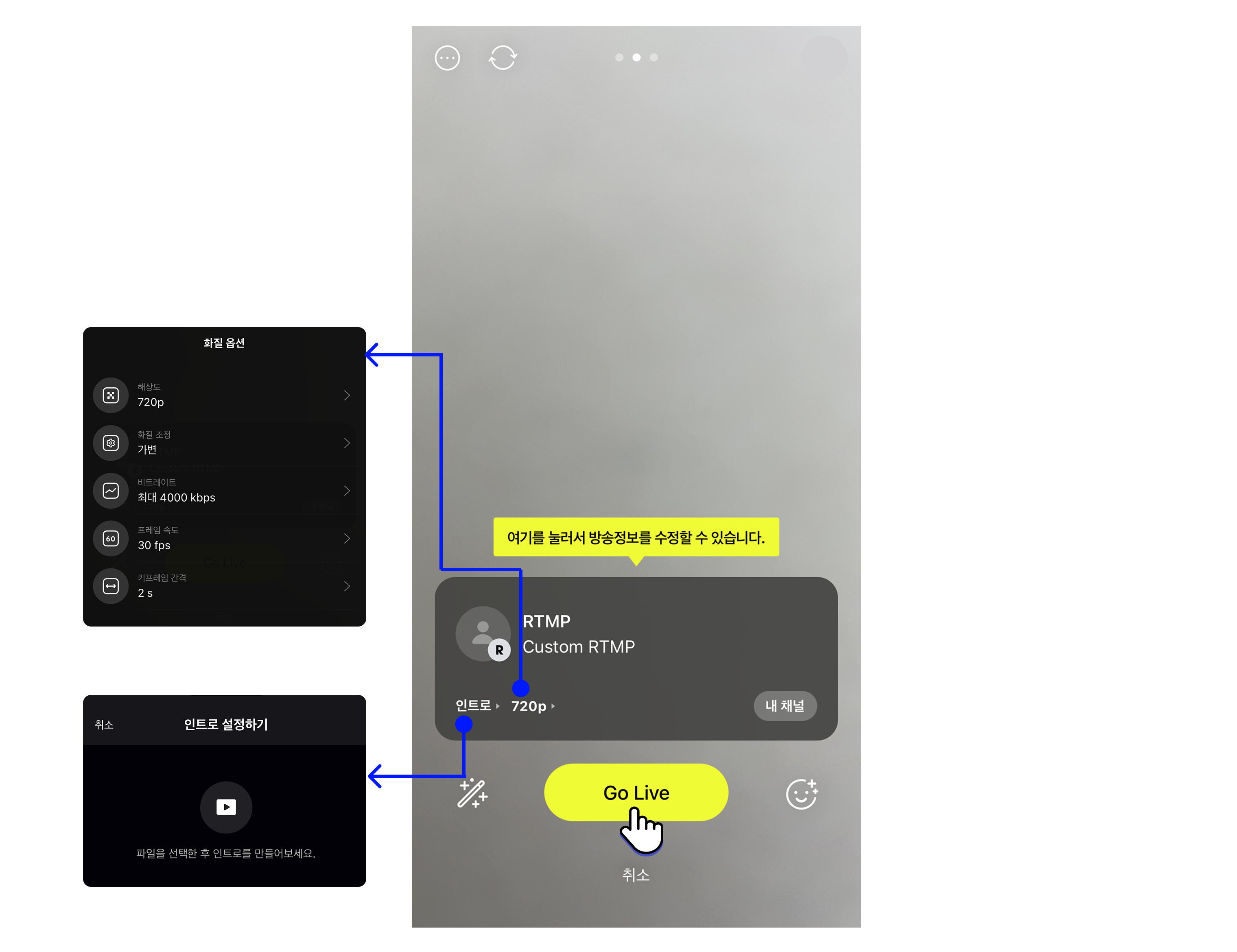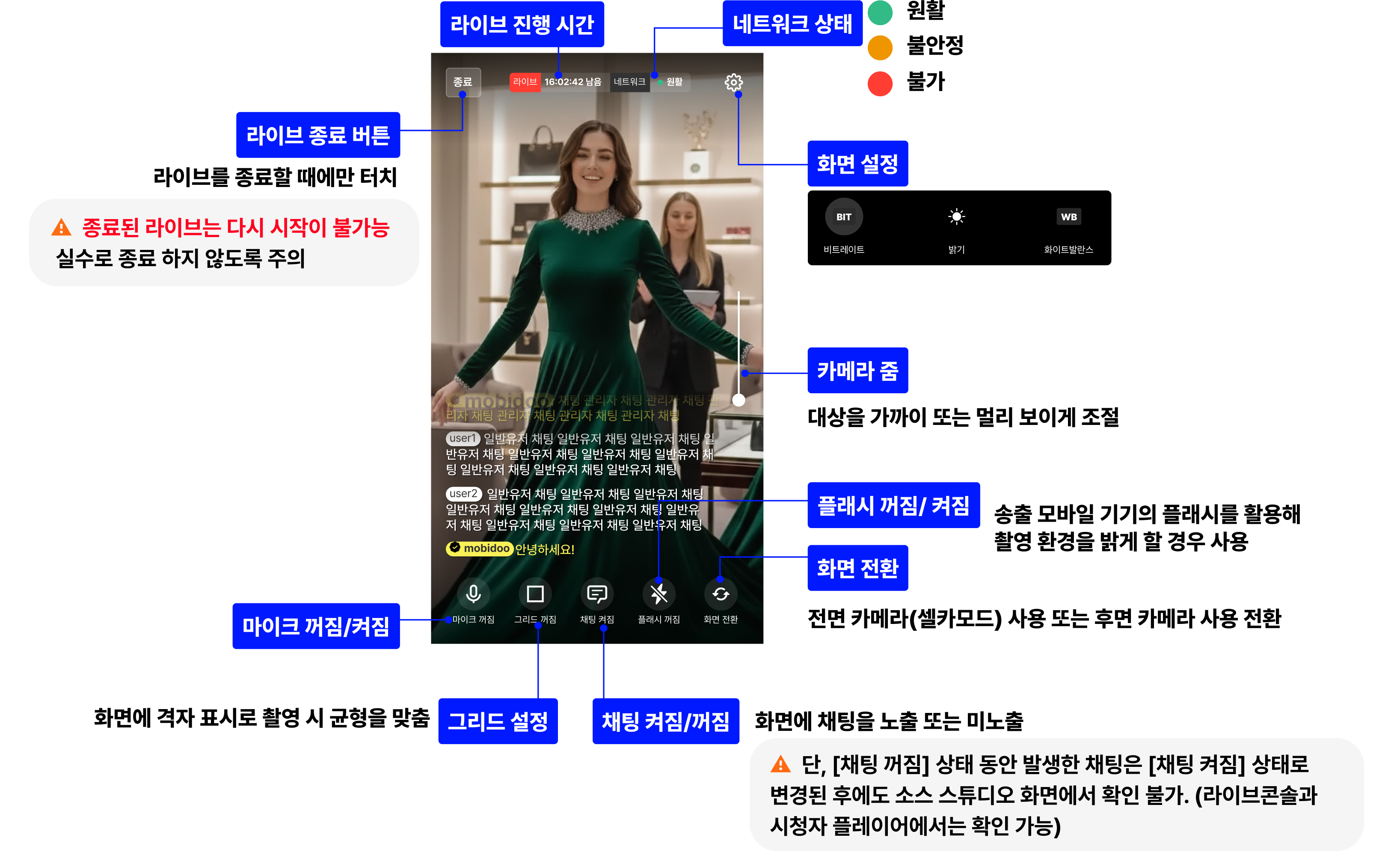 시작하기 전 반드시 라이브를 진행할 현장의 네트워크 환경을 확인해 가장 양호한 속도의 네트워크 방식으로 연결해 진행해주세요.
