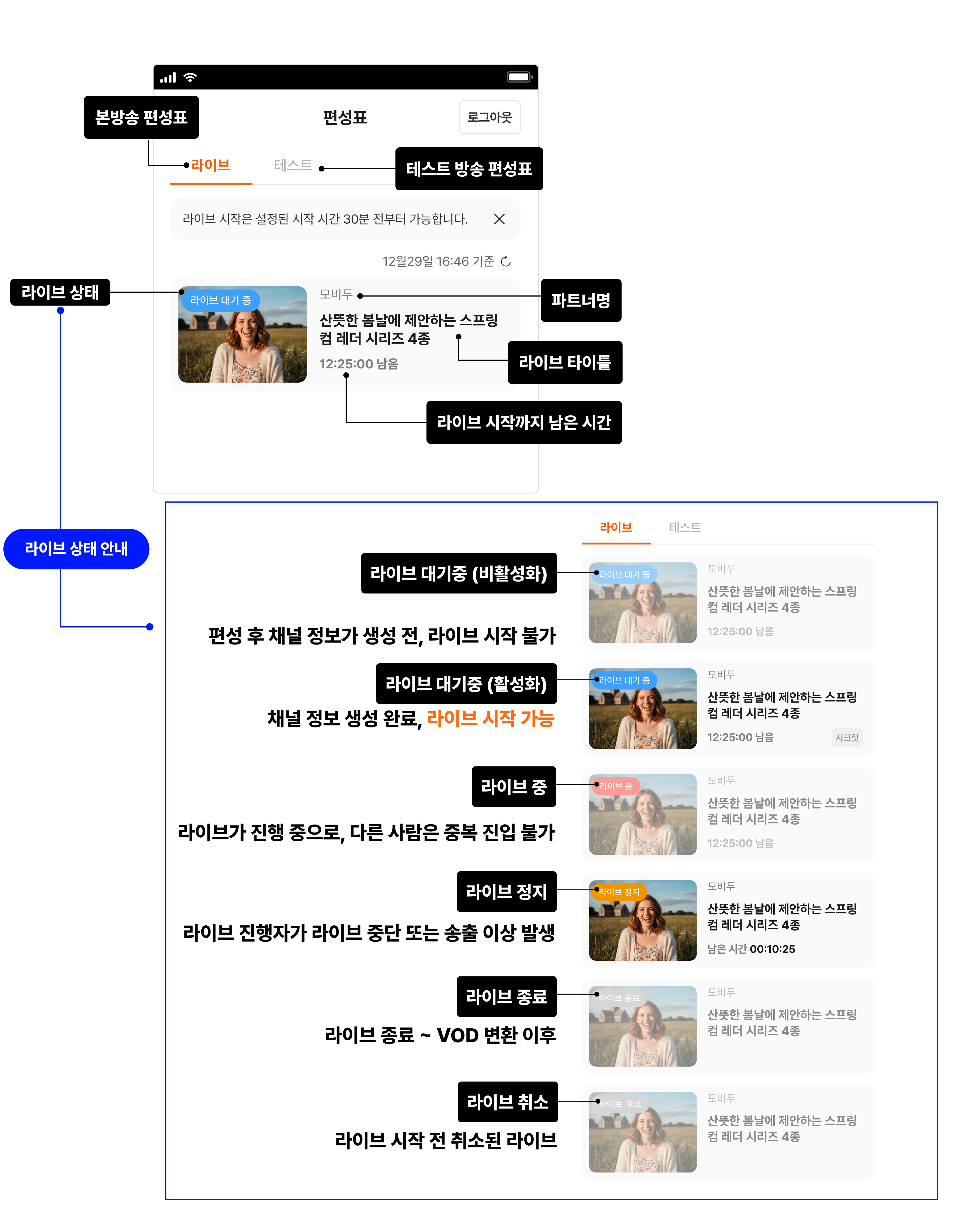 - 라이브 취소: 예정된 시작 시간 이후 30분이 지나도록 송출 없다면 자동 취소 처리