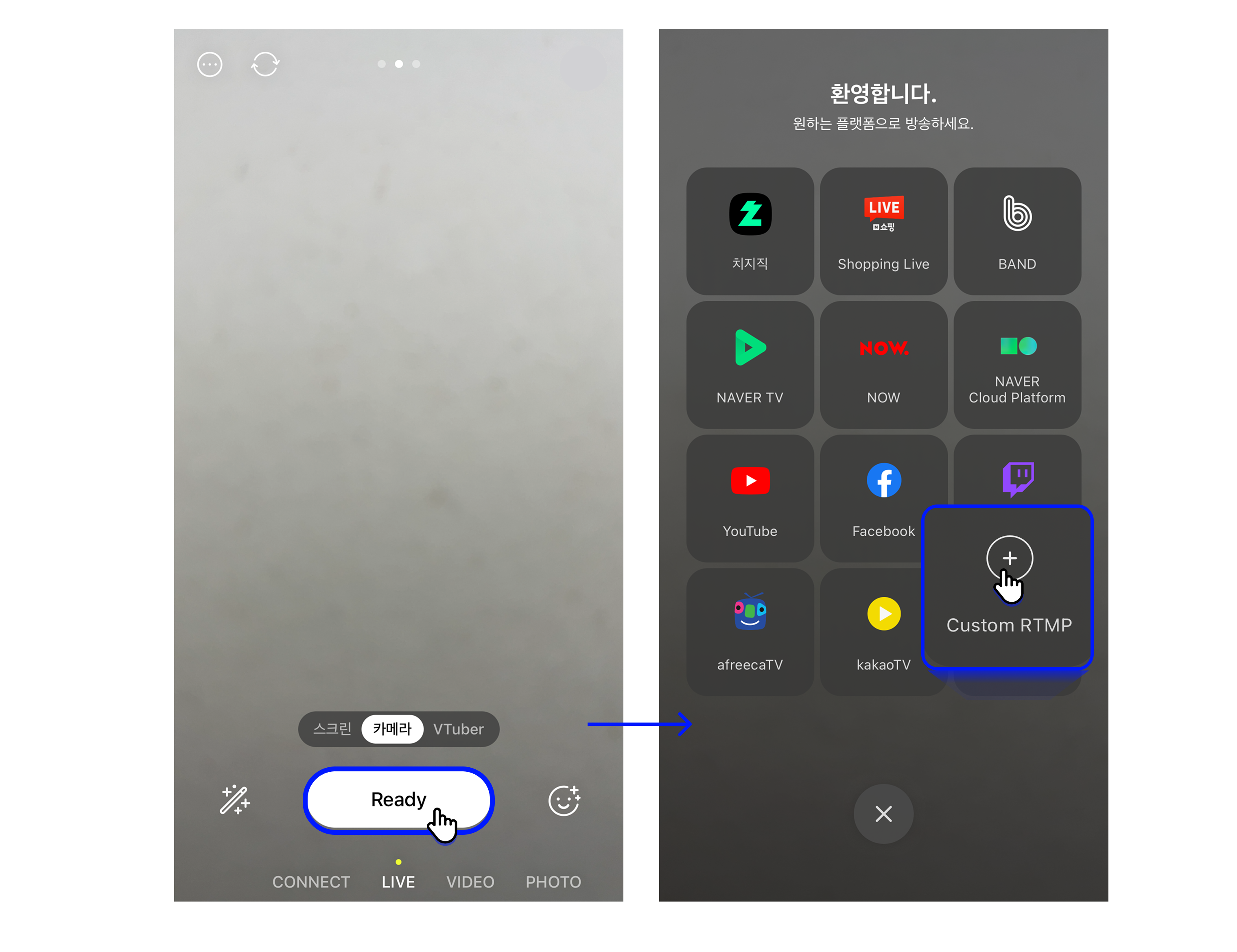 STEP 2. Ready를 클릭하여 Custom RTMP를 클릭합니다.