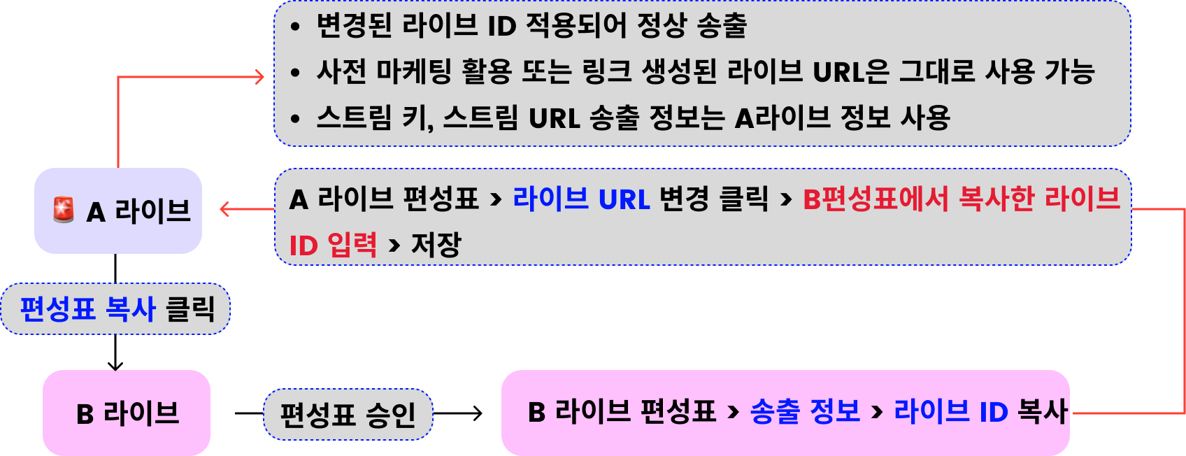 라이브 URL 변경 기능은 라이브 송출에 문제가 발생했을 때, 새로운 편성표로 방송을 이어 진행하더라도 처음 생성된 라이브 URL을 그대로 유지할 수 있도록 지원해 시청자가 해당 URL 그대로 접속할 수 있도록 지원합니다.