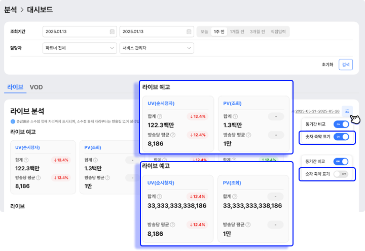 데이터 증감률은 동기간 비교 토글을 클릭해 표시 하거나, 미표시 할 수 있습니다. - 데이터 축약 : 대시보드의 수치를 축약 표시 여부를 선택할 수 있습니다.