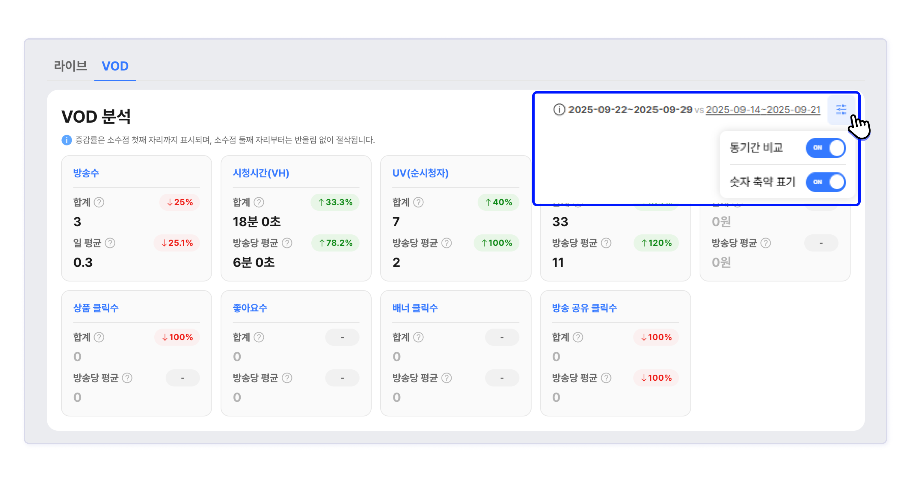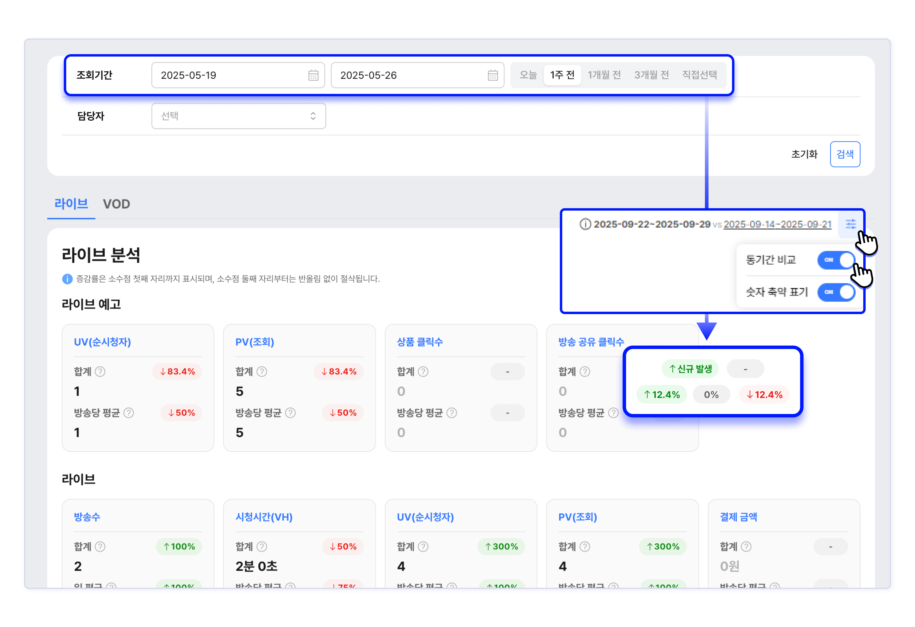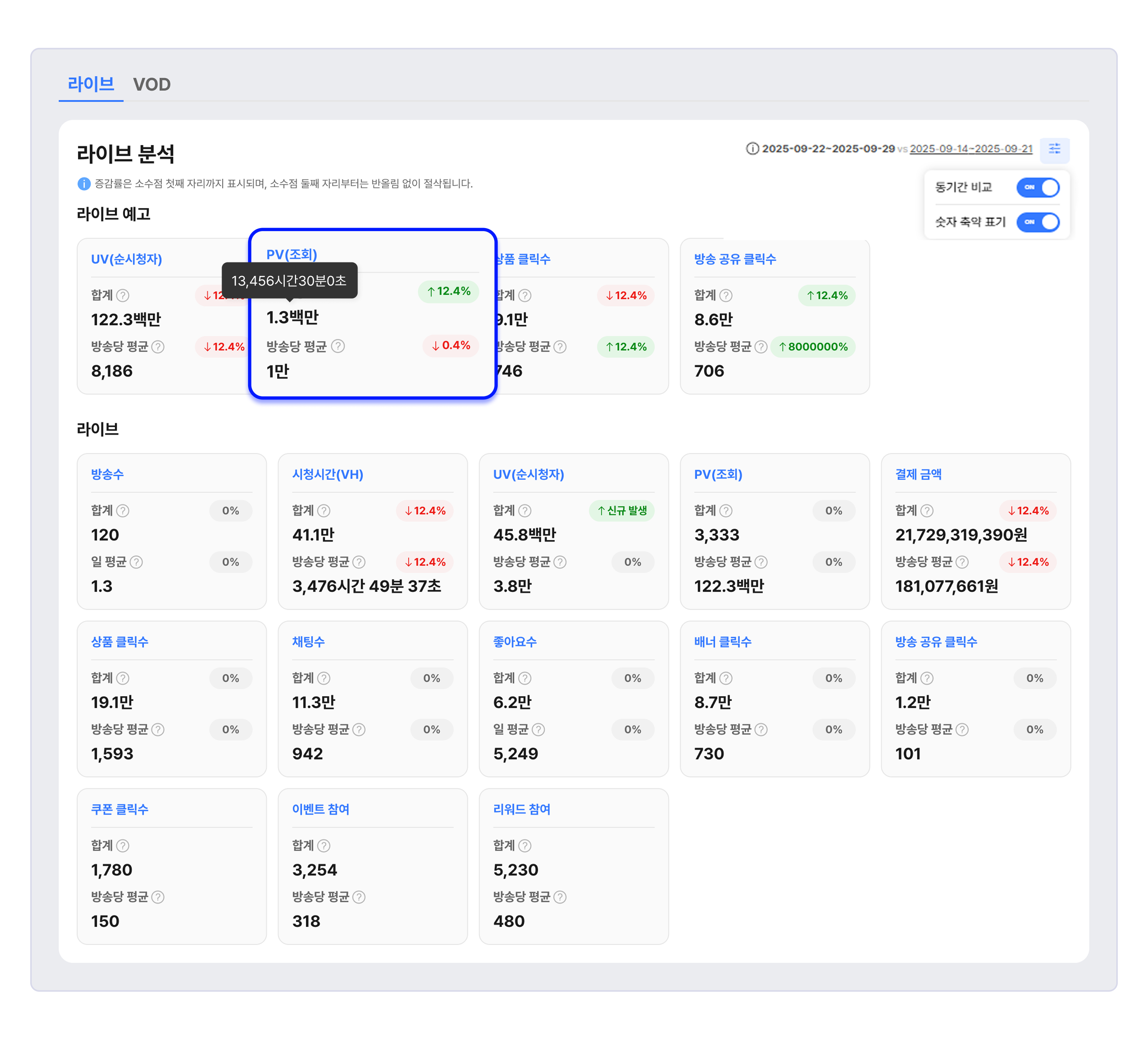 방송수, 시청 시간(VH), UV, PV, 결제 금액, 상품 클릭수, 채팅수, 좋아요 수, 배너 클릭수, 슬롯 배너 클릭수, 방송 공유 클릭수 항목에 대해 조회 기간과 동일한 이전 기간의 데이터를 비교하여 증가율 또는 감소율을 배지(Badge)형태로 표기합니다.
