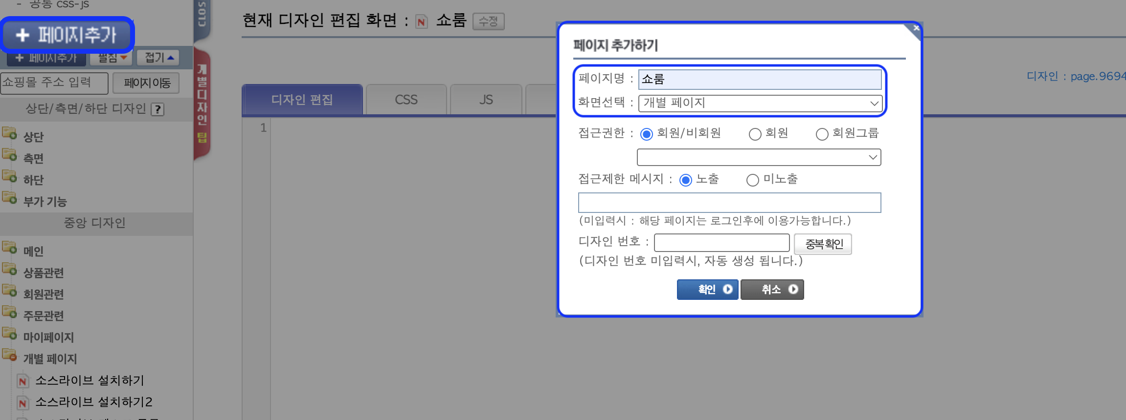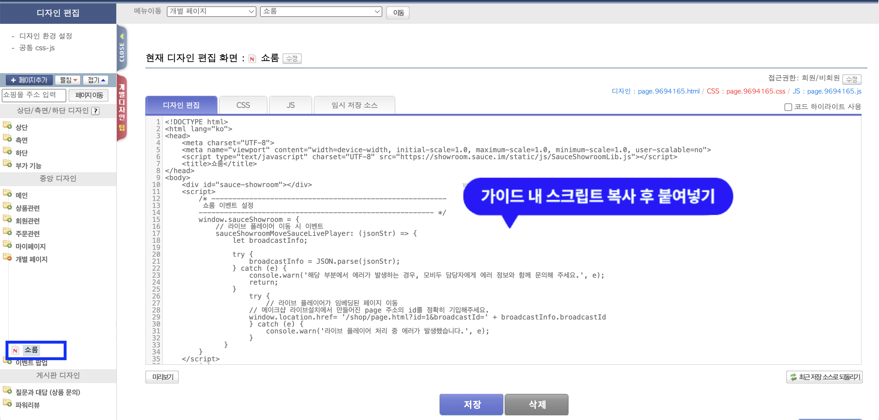 STEP 4. 추가한 개별페이지의 디자인 편집 영역에 아래의 코드를 붙여 넣은 후, 저장을 클릭합니다.