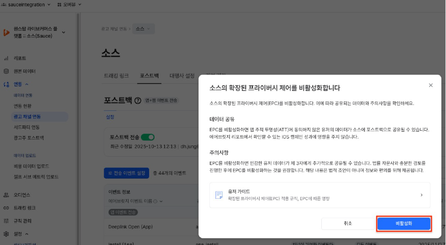 STEP 5. 포스트백 항목을 클릭 후, 확장된 프라이버시 제어(EPC) 를 비활성화 합니다.