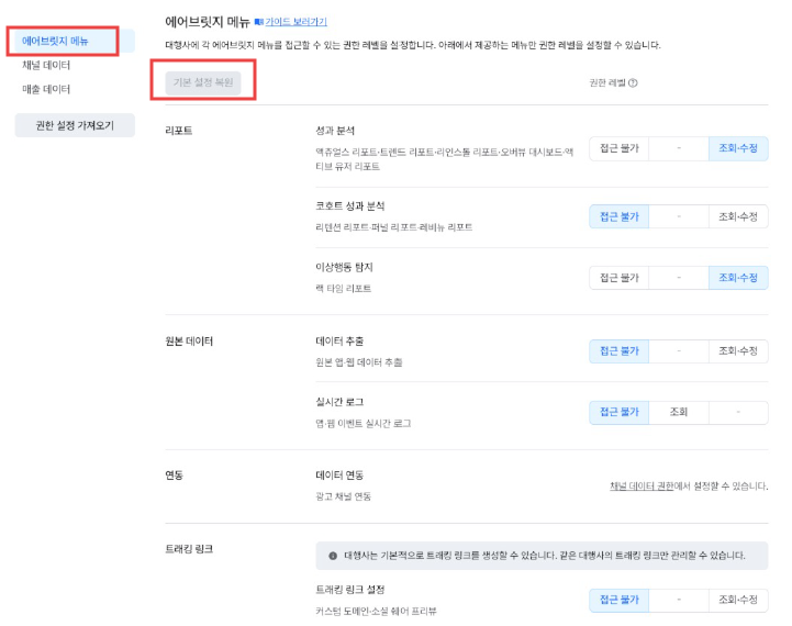 STEP 7. 앱 접근 권한은 에어브릿지, 채널 데이터, 매출 데이터로 구분됩니다.