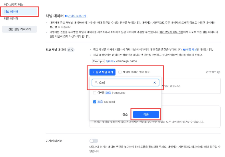 STEP 7-2. 채널 데이터의 경우, 광고 채널 추가 > 소스 검색 > 체크 후 적용 버튼을 클릭합니다.
