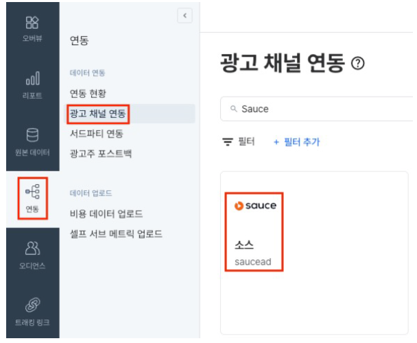 STEP 1. Airbridge에 접속해서 연동 > 광고 채널 연동 > Sauce를 검색합니다.