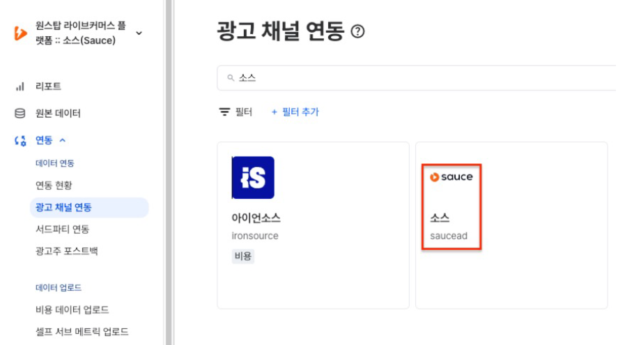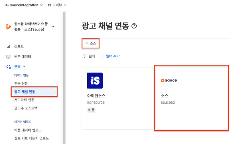 STEP 1. 연동 > 광고 채널 연동을 클릭 후, 소스를 검색해 결과를 클릭합니다.
