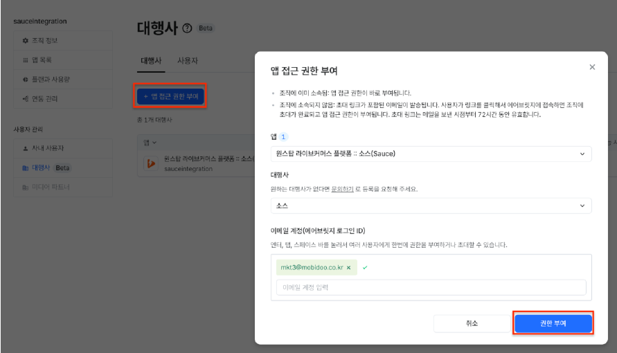 STEP 4. 앱 항목에는 접근 권한을 부여할 앱을 선택하고, 대행사는 소스, 이메일에는 [email protected]을 입력 후 권한 부여를 클릭합니다.