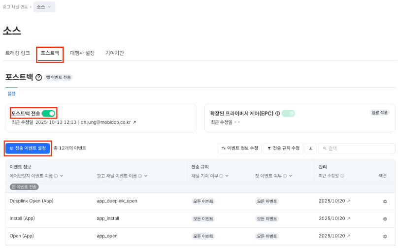STEP 2. 포스트백을 클릭 후, 포스트백 전송 토글을 ON으로 설정합니다.