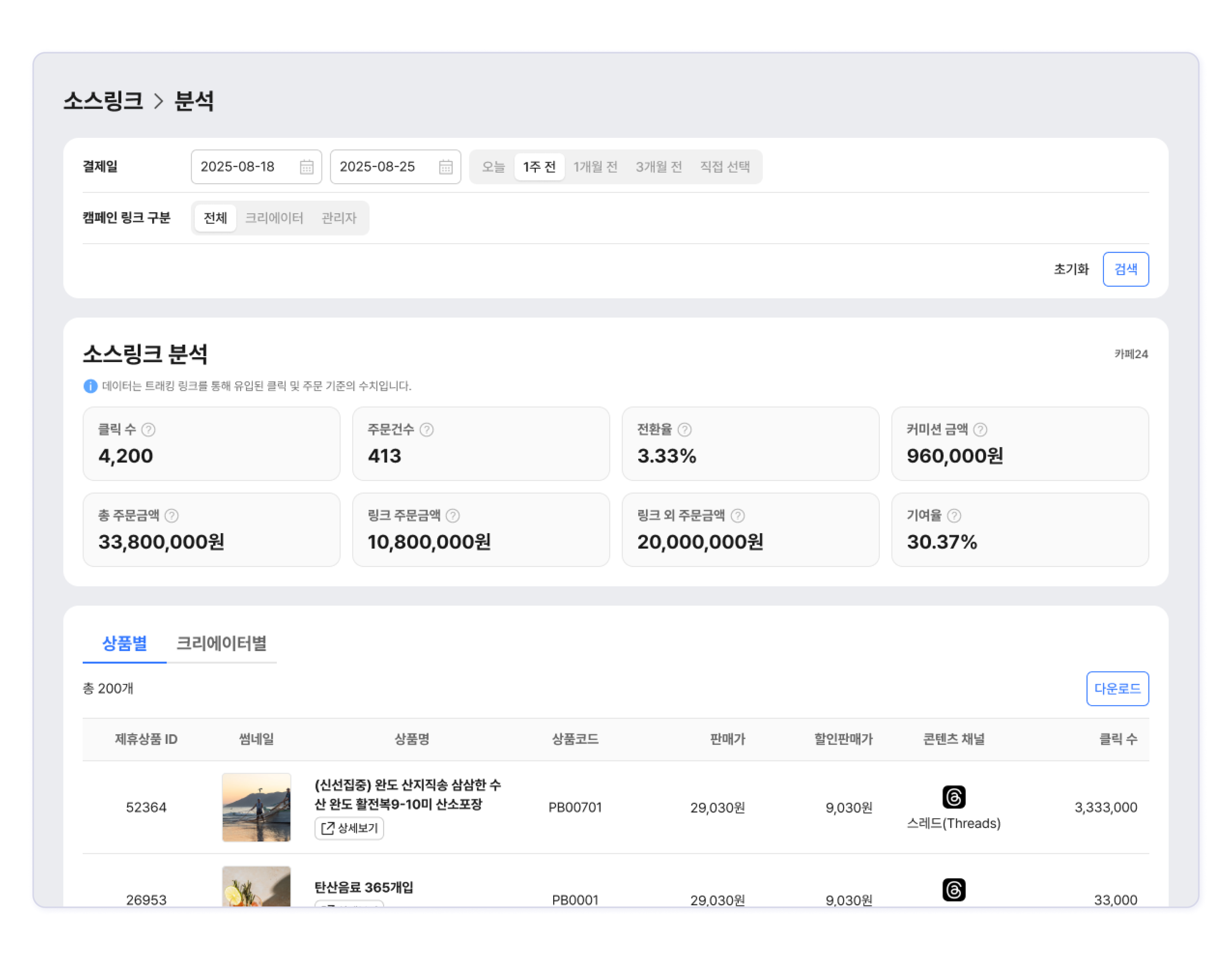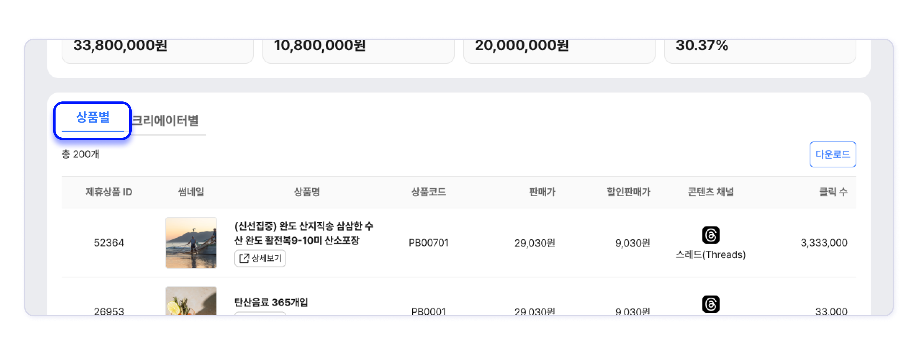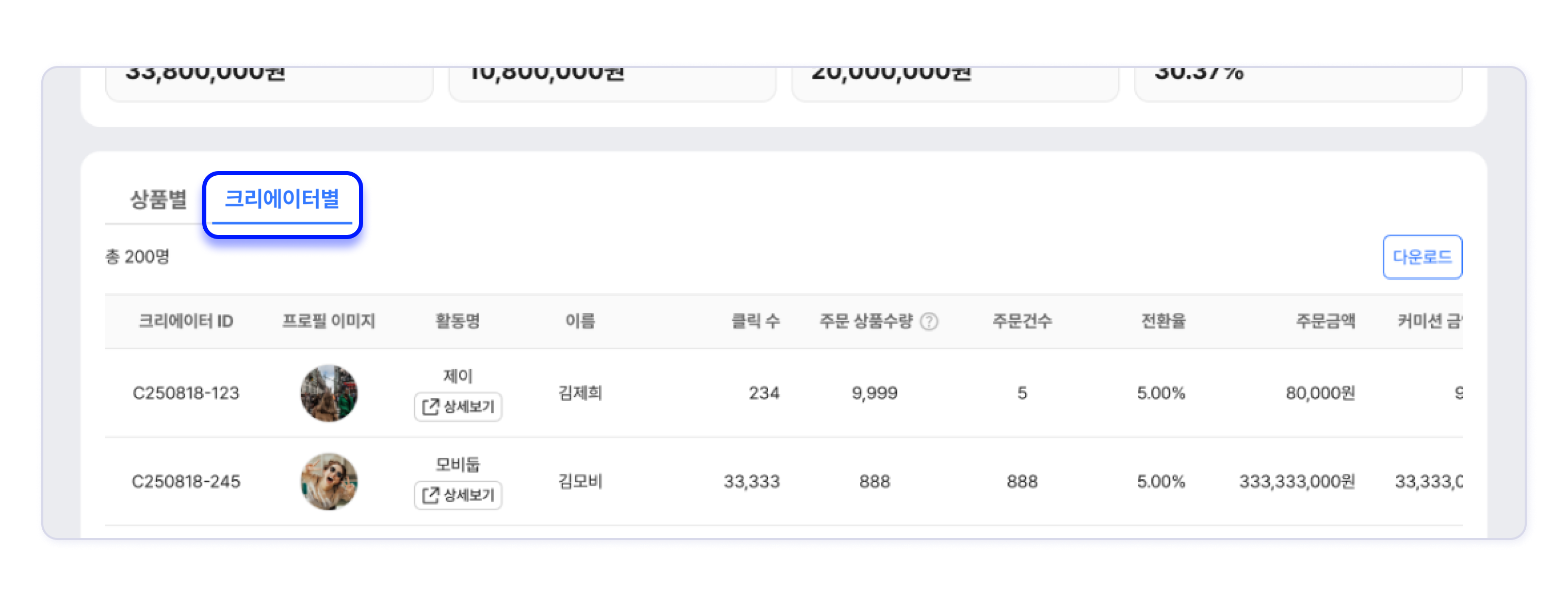 크리에이터별 성과를 목록에서 확인하고 다운로드 버튼을 클릭해 파일로 받을 수 있습니다.