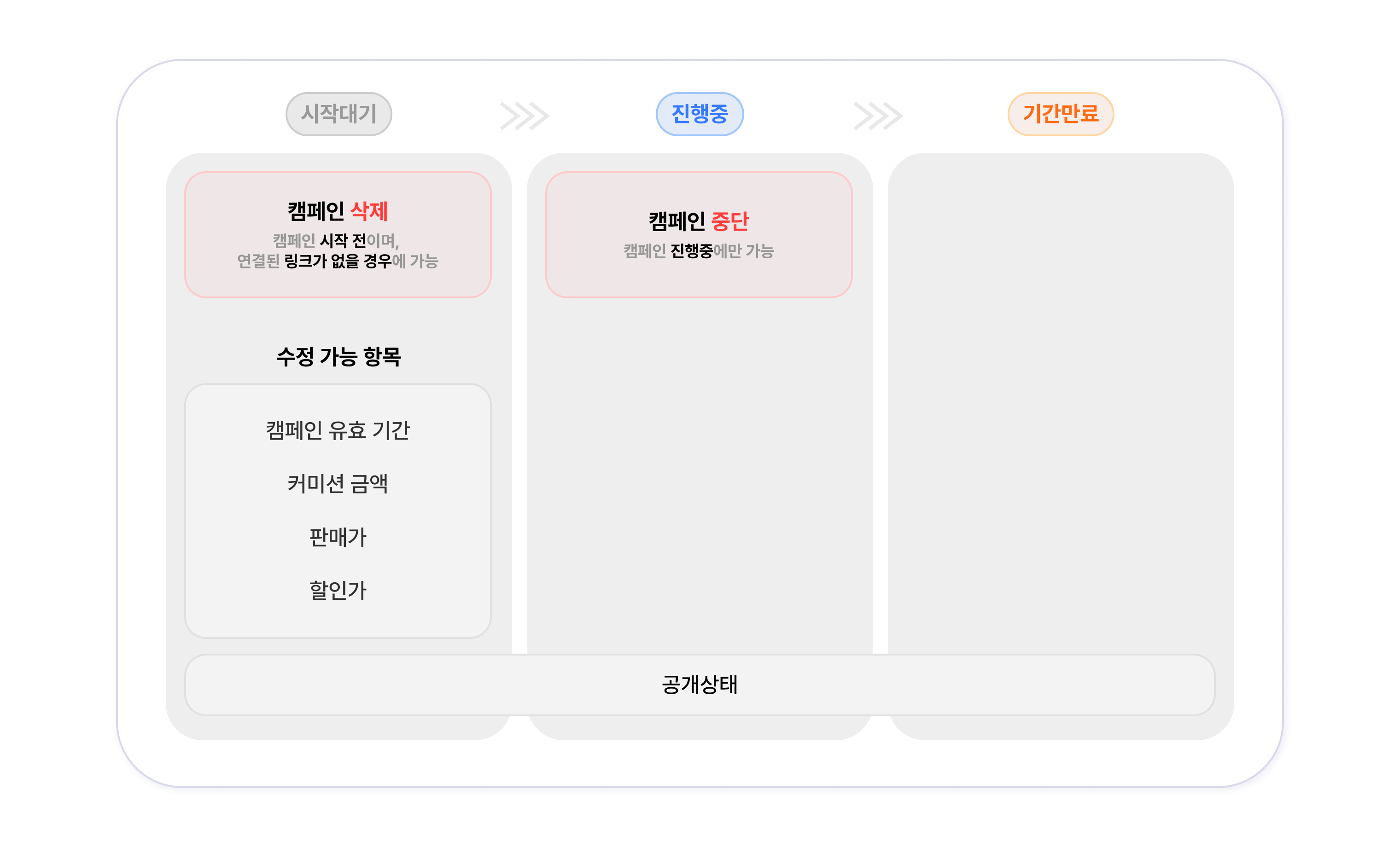 캠페인 유효 기간과 공개 상태 설정값에 따라 추후 크리에이터 페이지 내 상품 노출 여부가 달라지므로 고려해 설정해야 합니다.