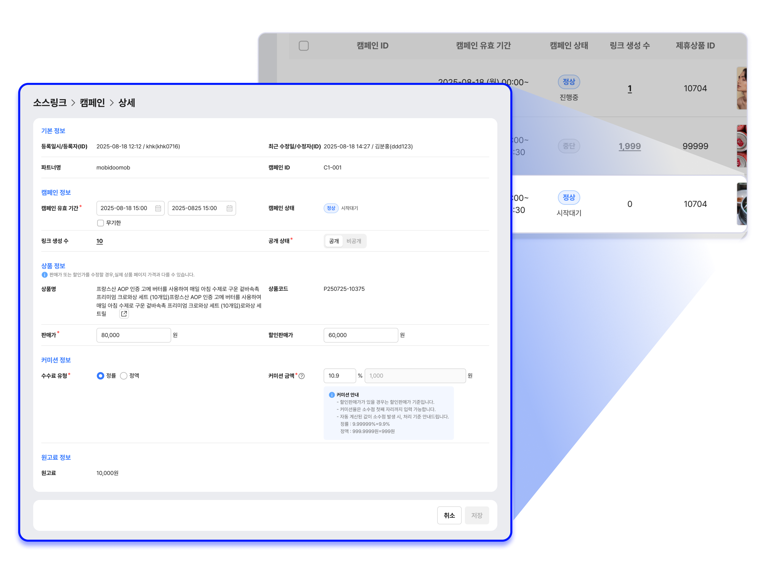 소스링크의 캠페인은 상품 단위로 운영되며, 공개 여부, 수수료 유형, 커미션 조건 등을 설정해 캠페인으로 등록할 수 있습니다. 해당 캠페인으로 크리에이터가 본인 채널에서 링크를 생성해 수익 활동에 사용할 수 있습니다.