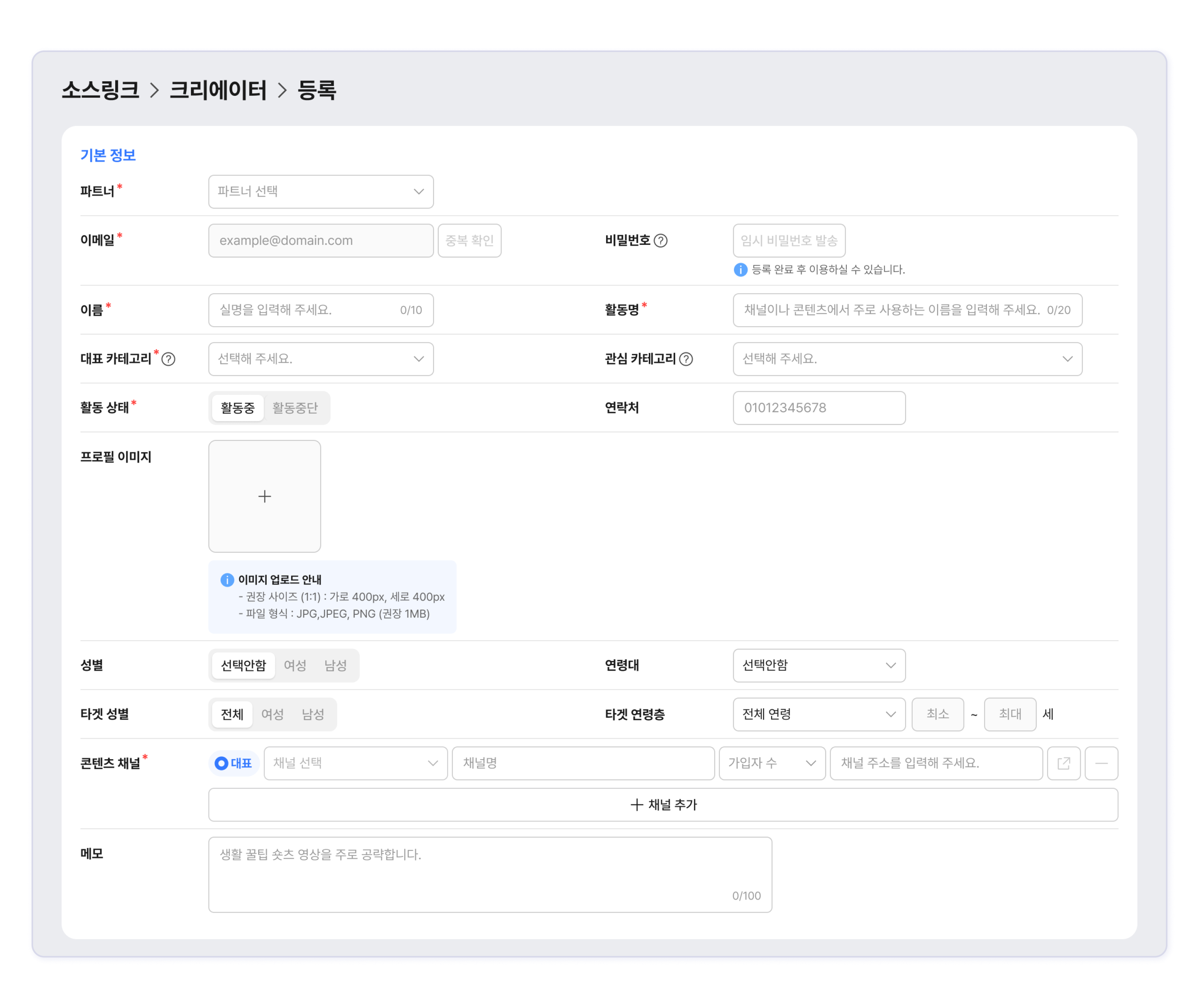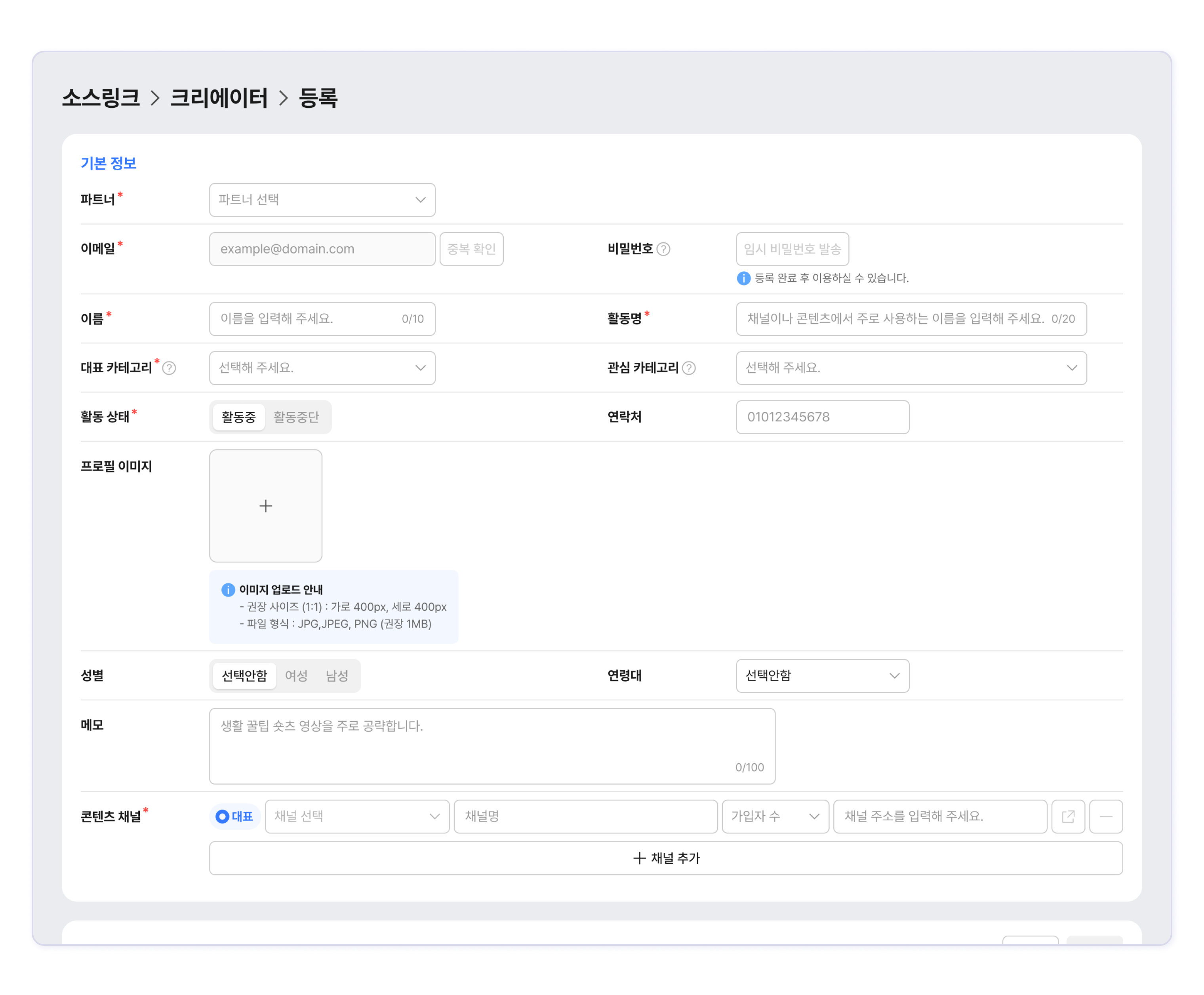 크리에이터의 특징이나 주요 활동 채널 등 정보를 입력합니다.