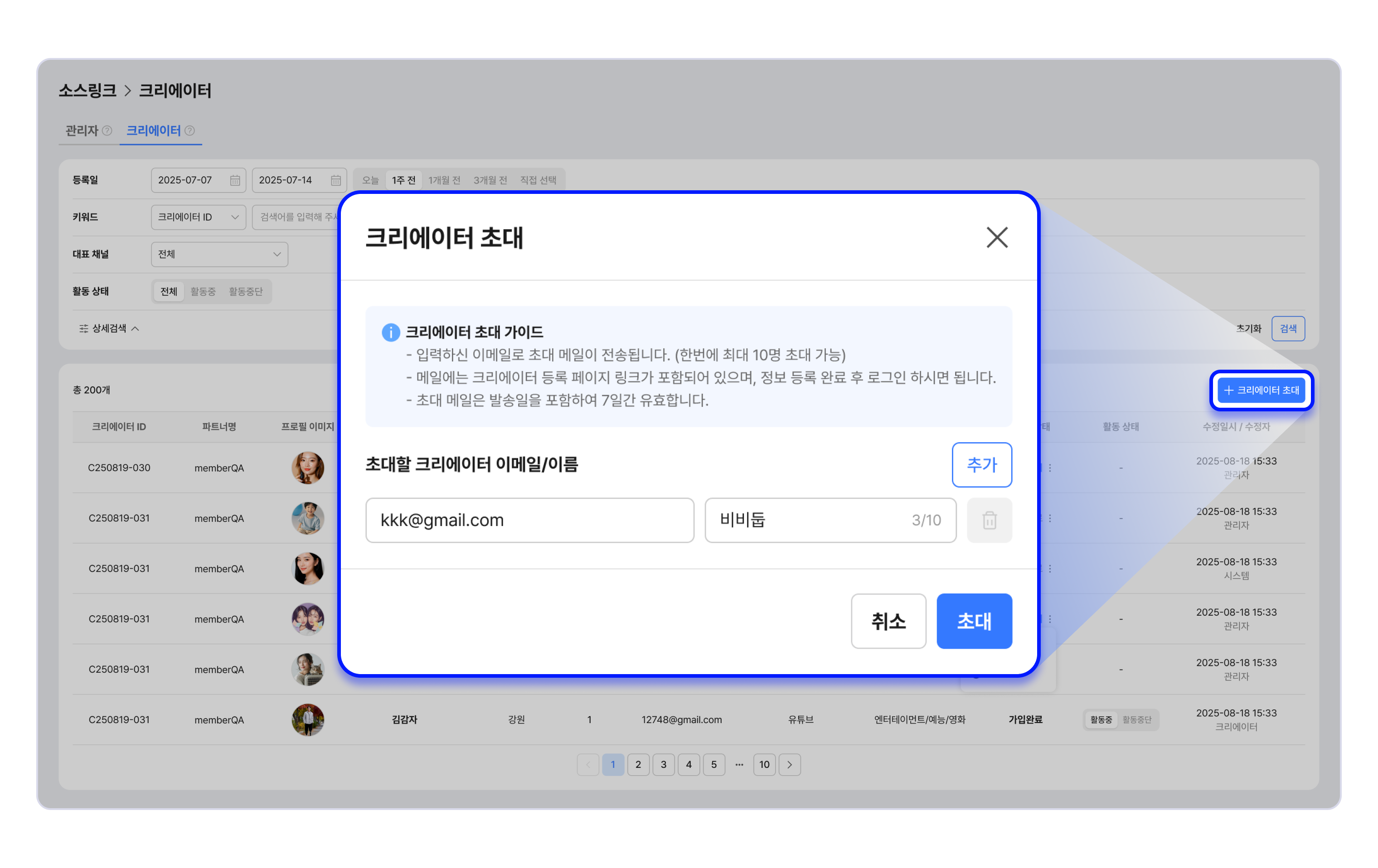 - 한번에 최대 10명의 크리에이터를 초대할 수 있습니다.