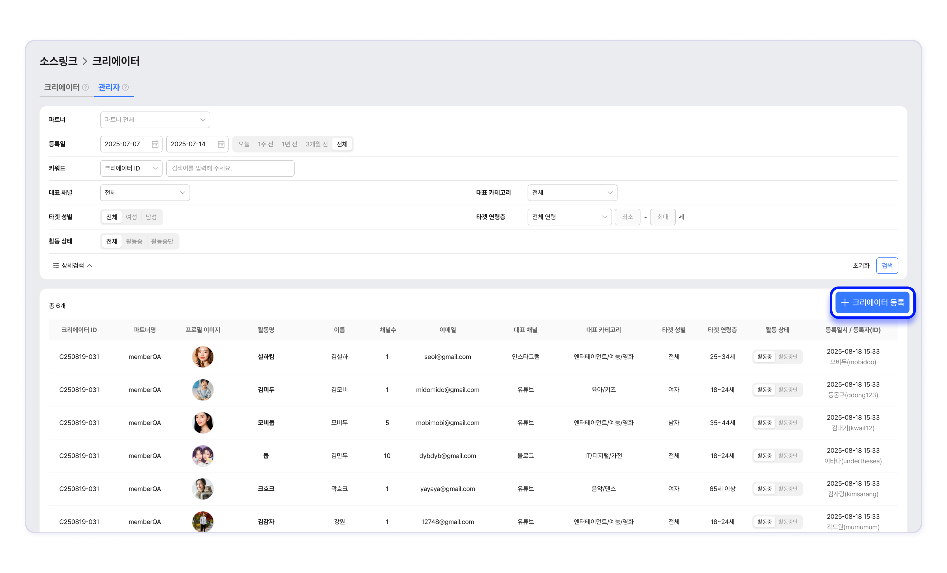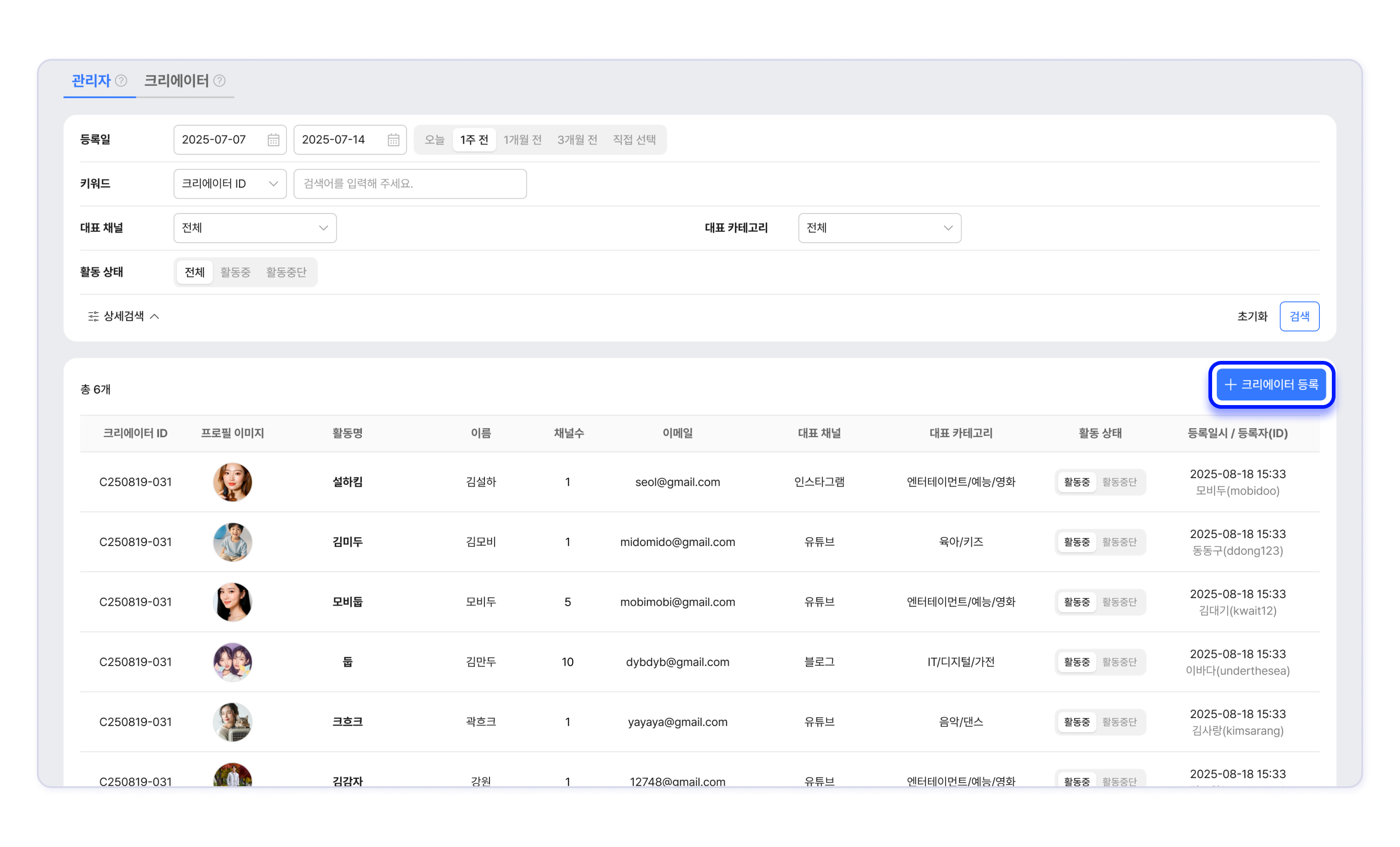 - 관리자 탭과 크리에이터 탭에서 등록 방식에 따른 크리에이터를 확인합니다.