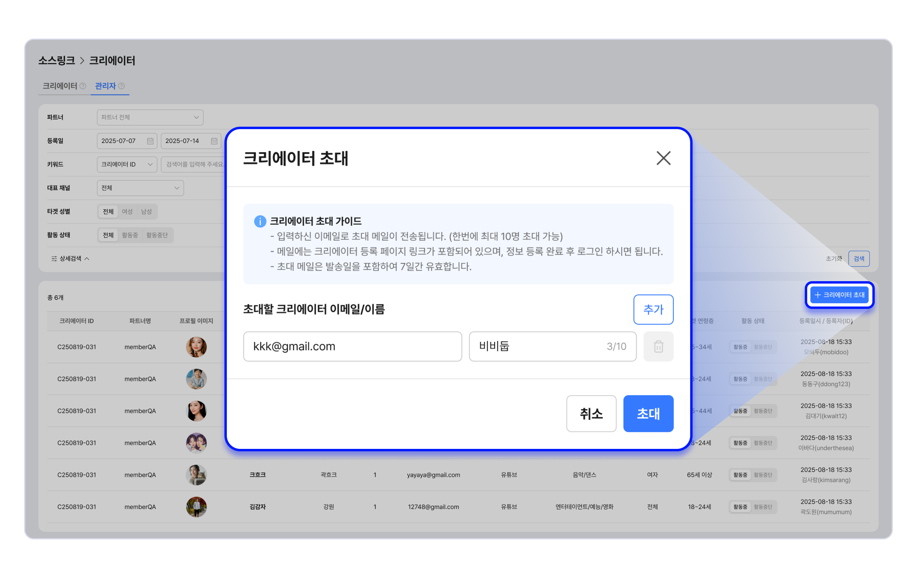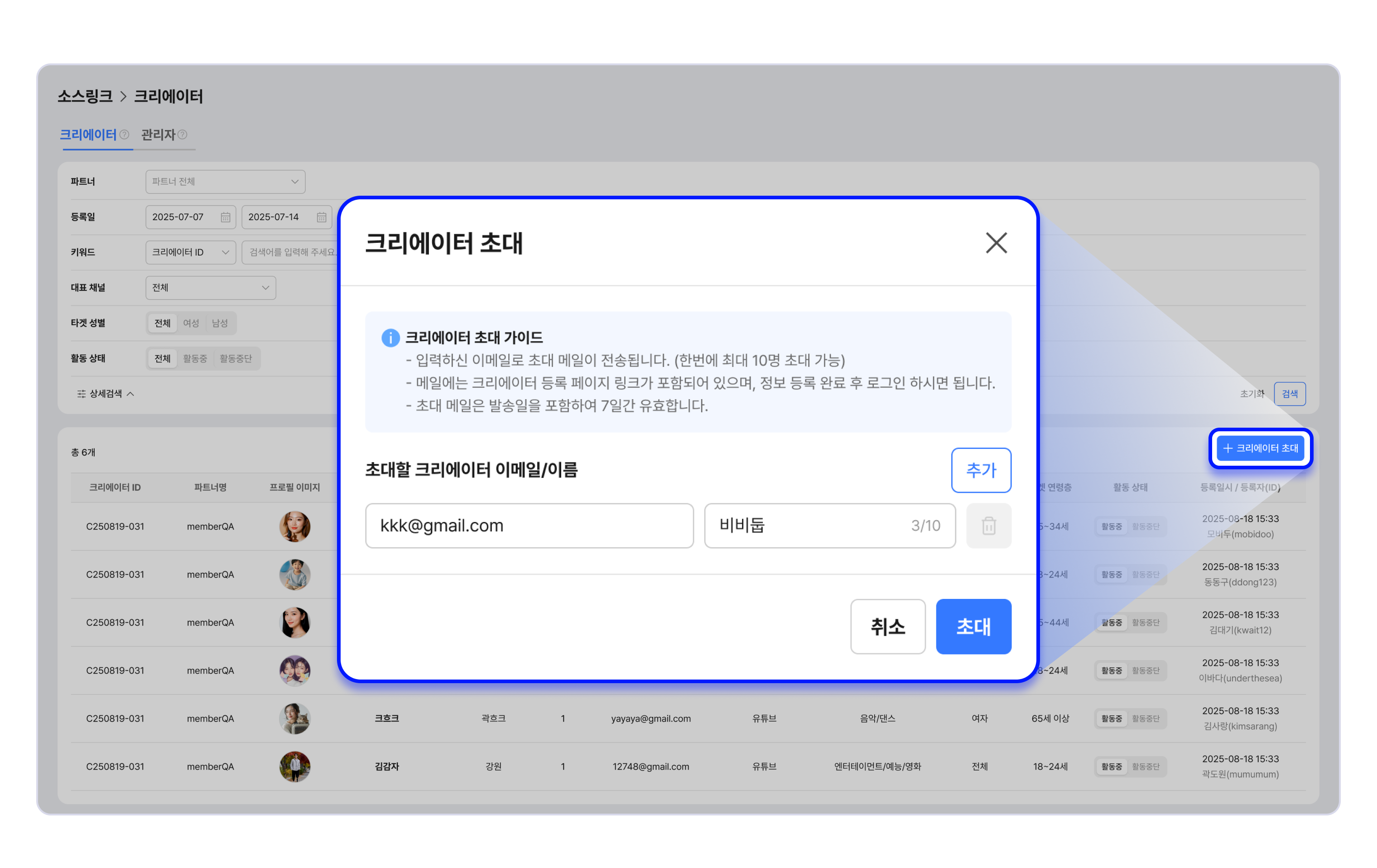 관리자는 초대 메일을 발송해 크리에이터가 직접 가입을 하도록 할 수 있습니다.