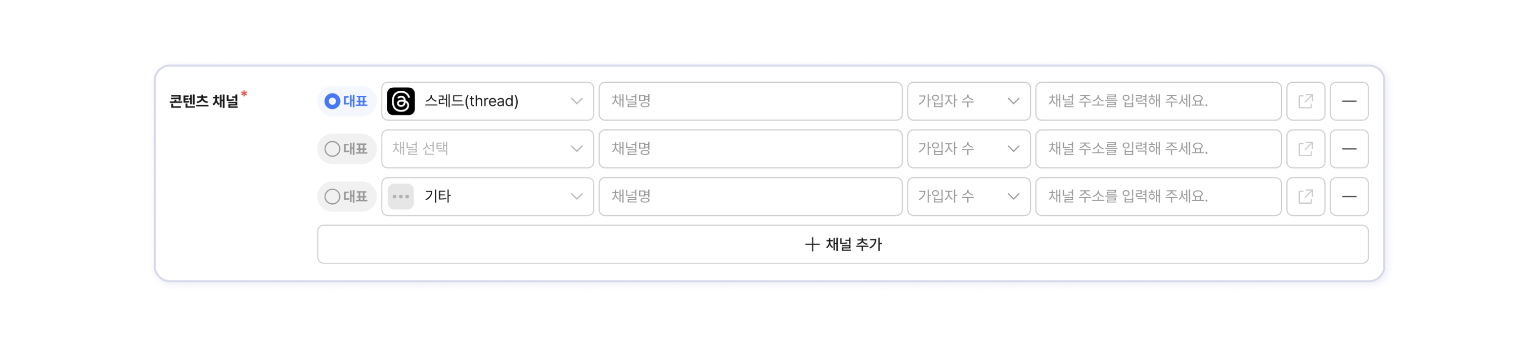 활동하는 채널 종류와 채널명, 채널 주소, 각 채널 가입자 수를 입력합니다.