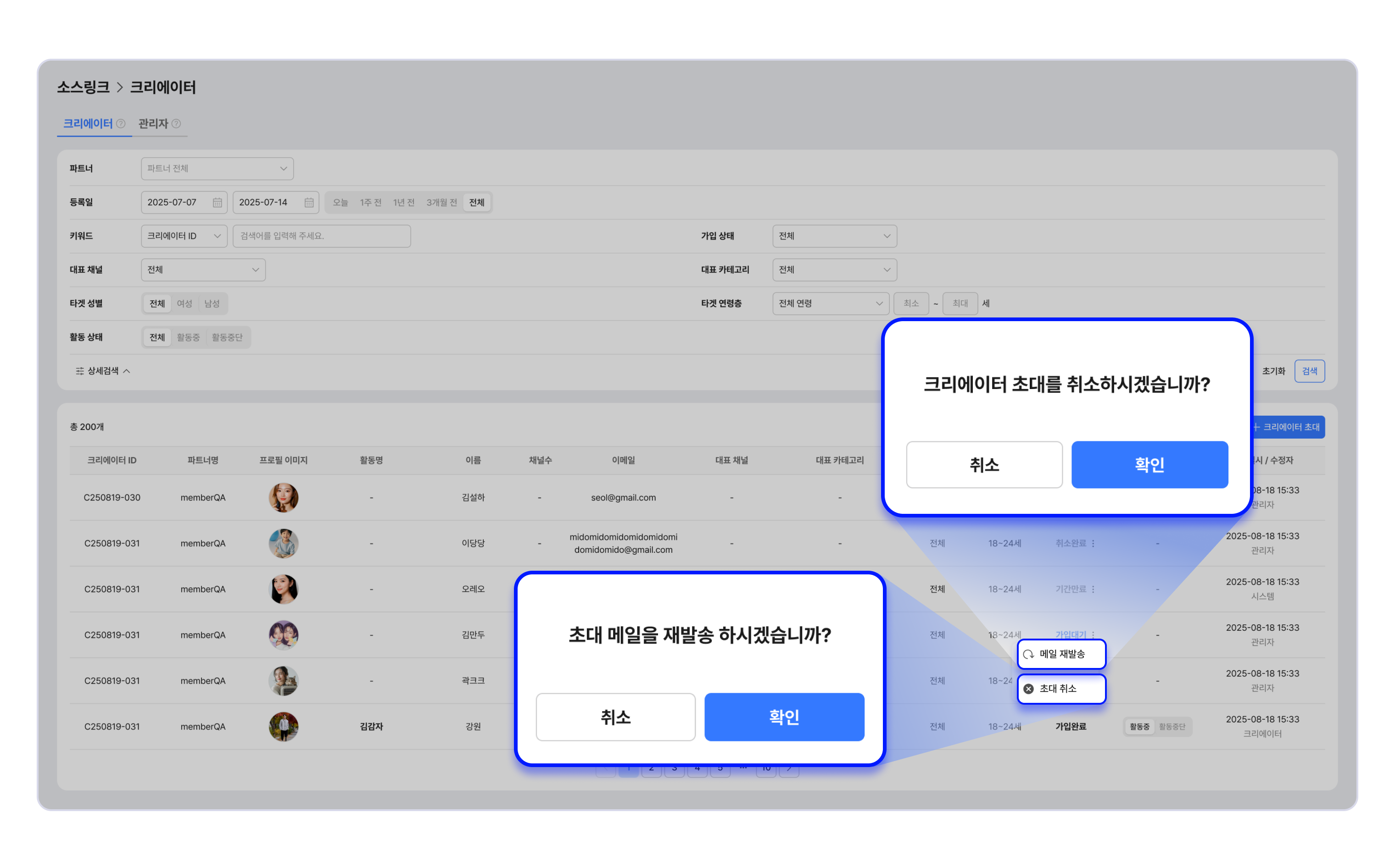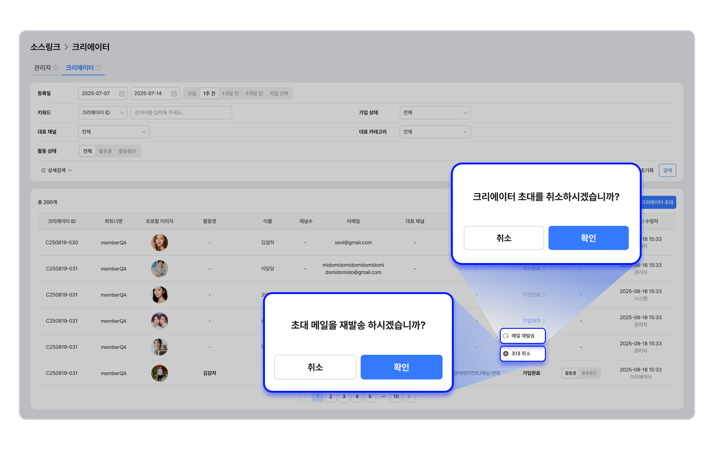 - 목록에서 크리에이터에게 초대 링크를 재발송하거나, 초대 취소할 수 있습니다.