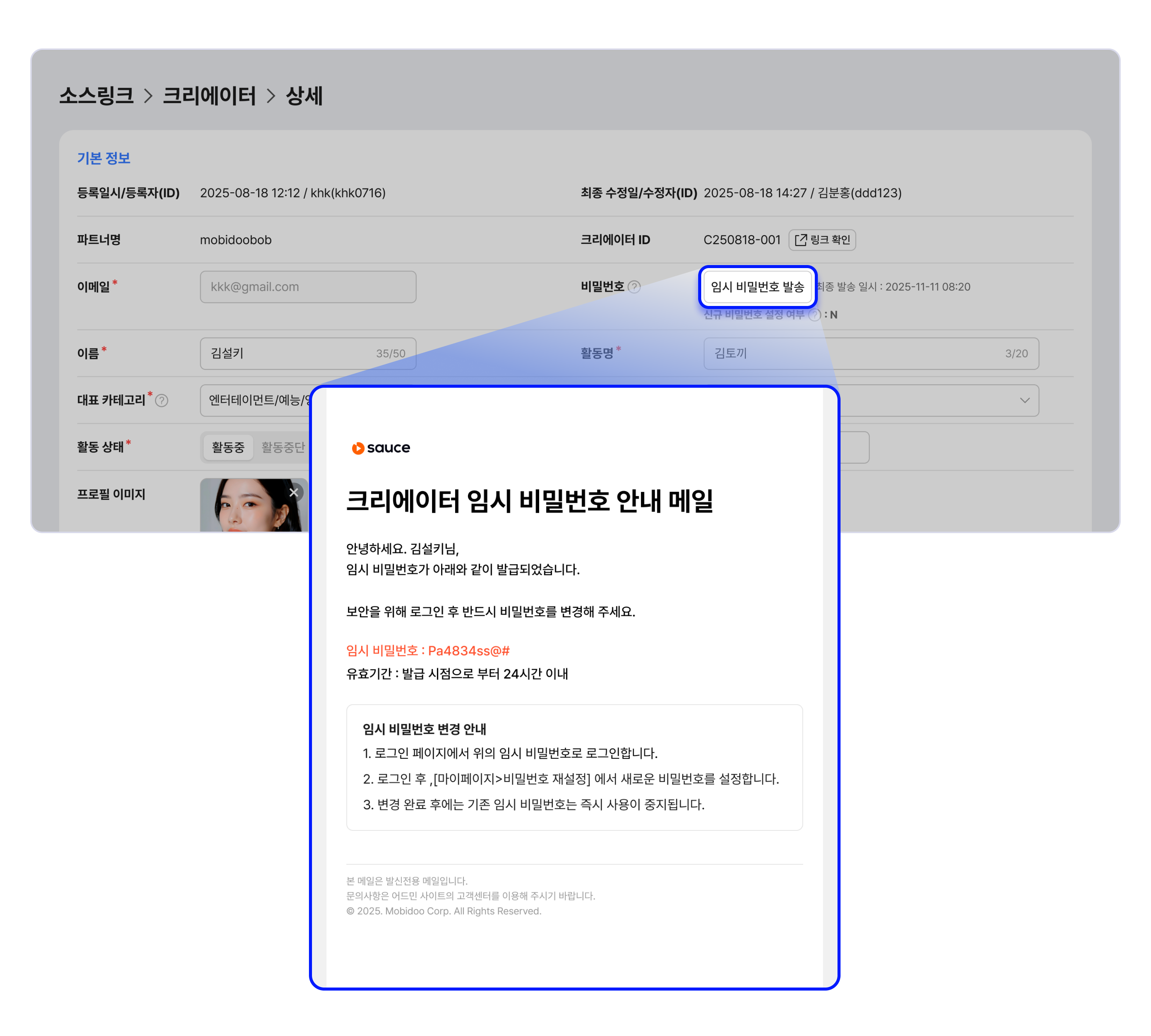 크리에이터 상세 화면에서는 크리에이터 정보 확인과 수정과 임시 비밀번호 발송이 가능합니다.
