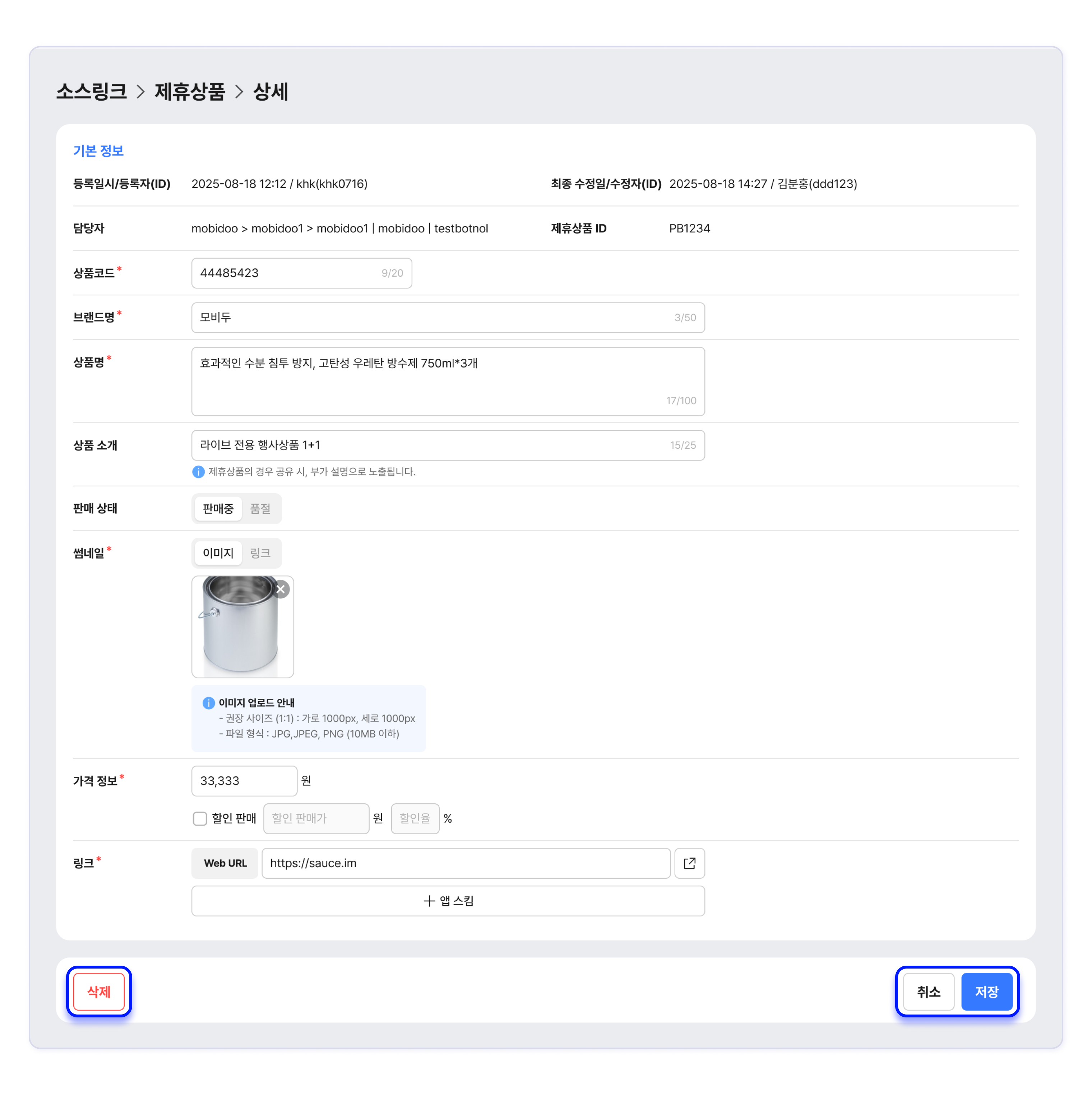 제휴상품 상세 화면에서는 상품 정보 수정과 삭제가 가능합니다.