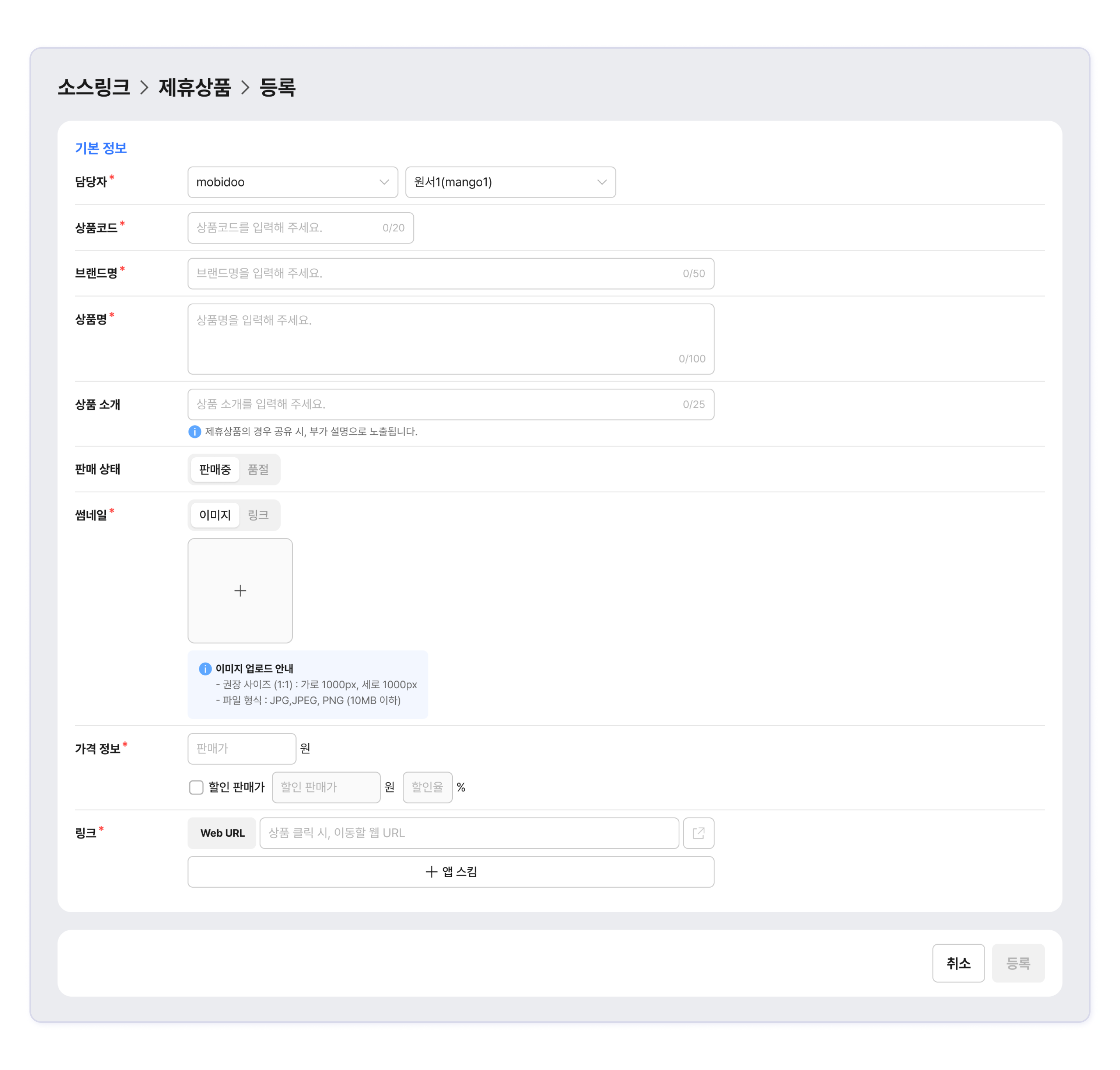 - 제휴상품으로 등록 시 상품 코드와 판매 가격은 필수 항목입니다.