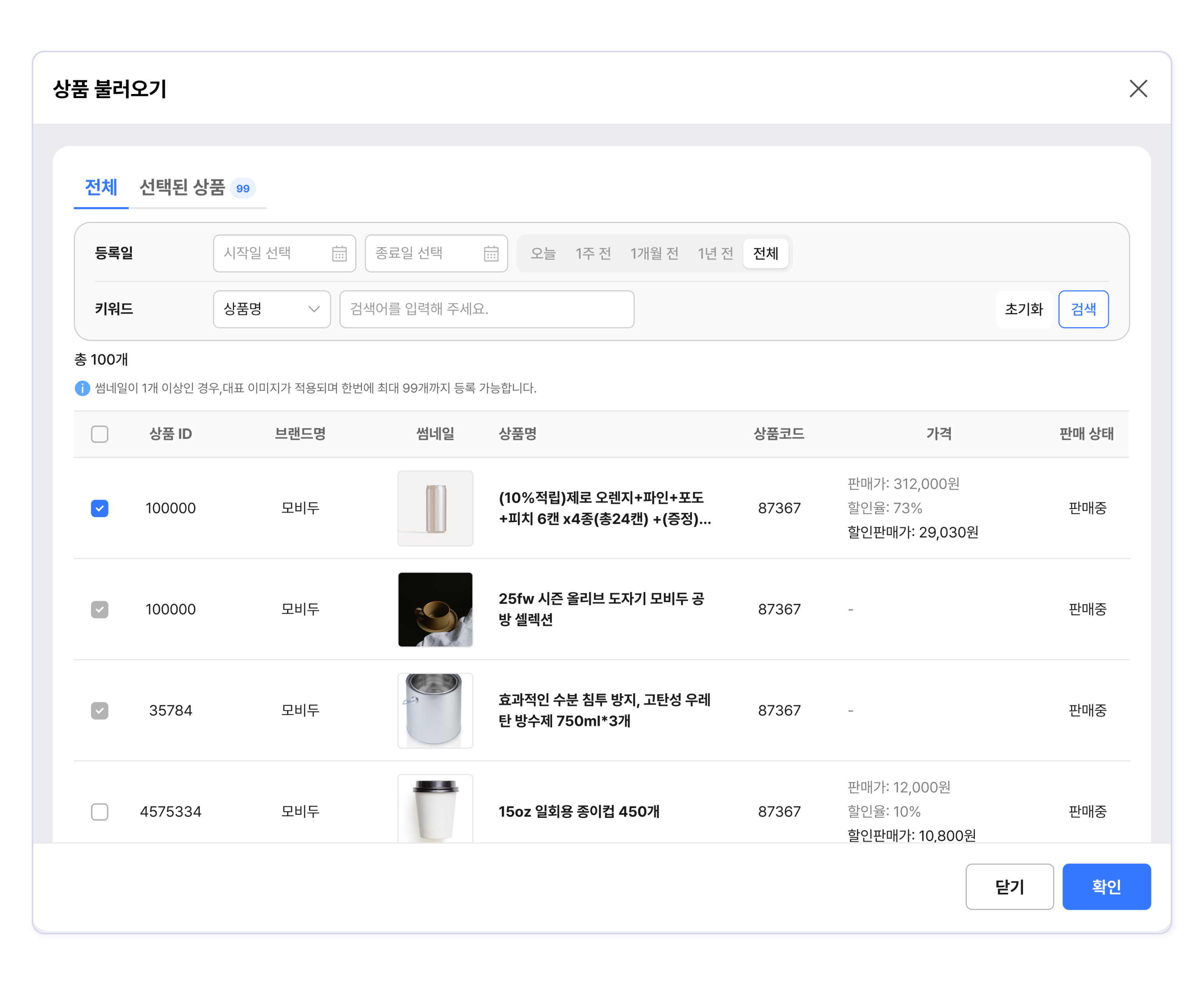 상품 불러오기 시 아래 조건을 확인해야 합니다.
