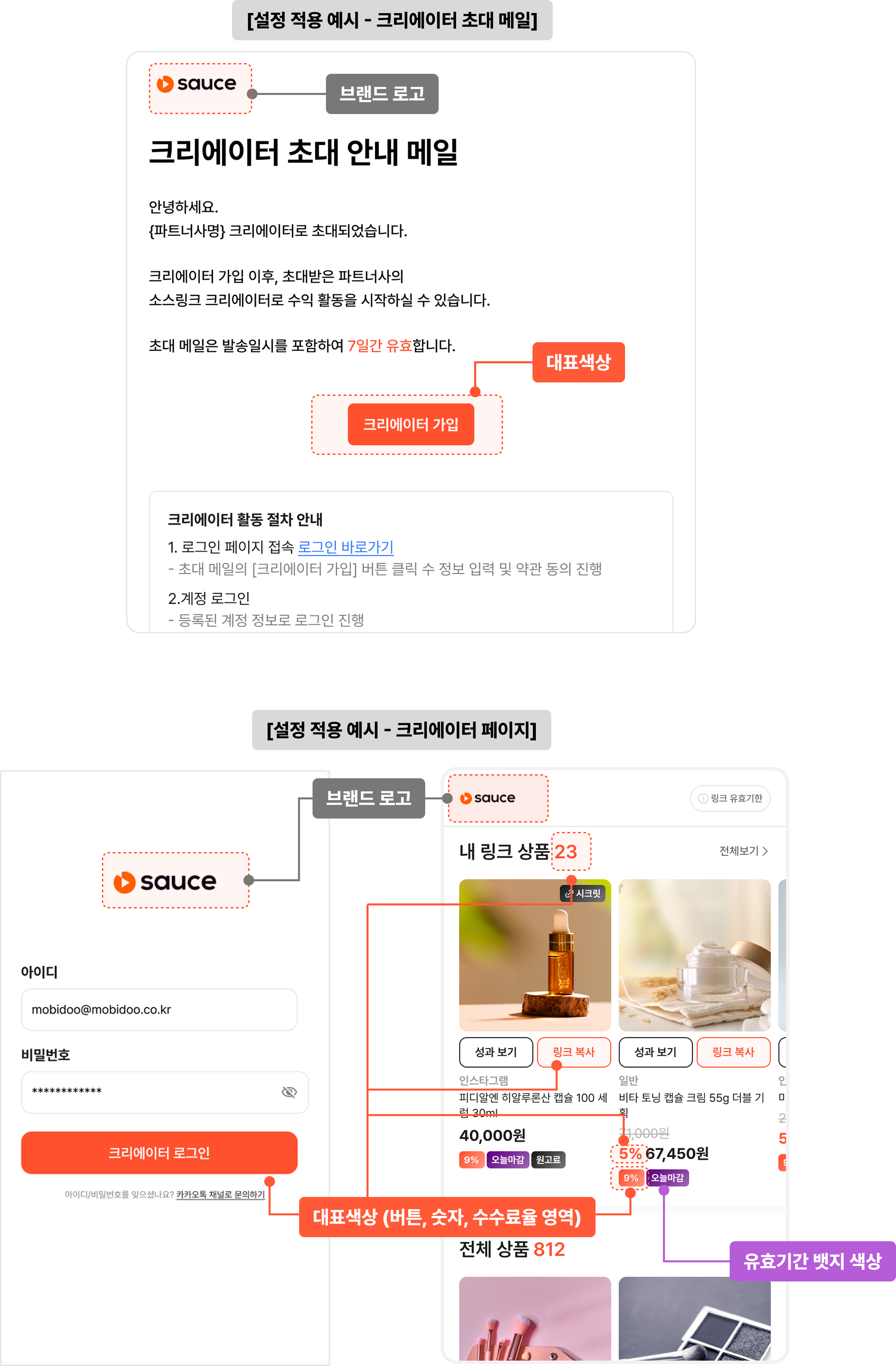 설정✅해당 기능은 (마스터) 관리자 계정에 한해 설정할 수 있습니다. 설정 화면 소스링크의 설정 관련 메뉴입니다. 브랜드 로고 브랜드 로고를 등록해두면, 크리에이터 초대 메일, 크리에이터 로그인 페이지에 공통 적용됩니다. 📘기본적으로 소스 로고가 적용 되어있습니다. X 클릭 후 이미지를 변경할 수 있습니다. 대표 색상, 유효기간 배지 색상 크리에이터 페이지에서 표시할 색상을 선택합니다. Updated 13 days ago 정산[크리에이터] 전용 가이드Ask AI