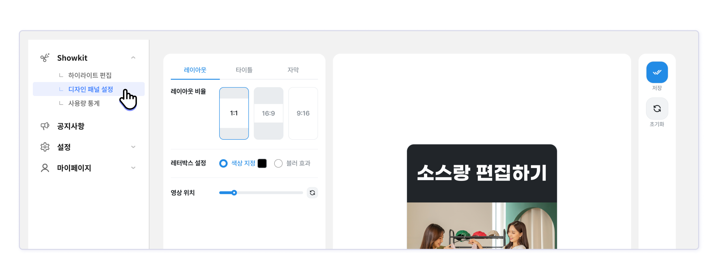 디자인 패널 설정은 로그인한 계정에 따라 하이라이트 편집 시 자주 사용하는 설정값을 기본으로 저장해 하이라이트 편집 시마다 편하게 편집을 진행할 수 있게 합니다.