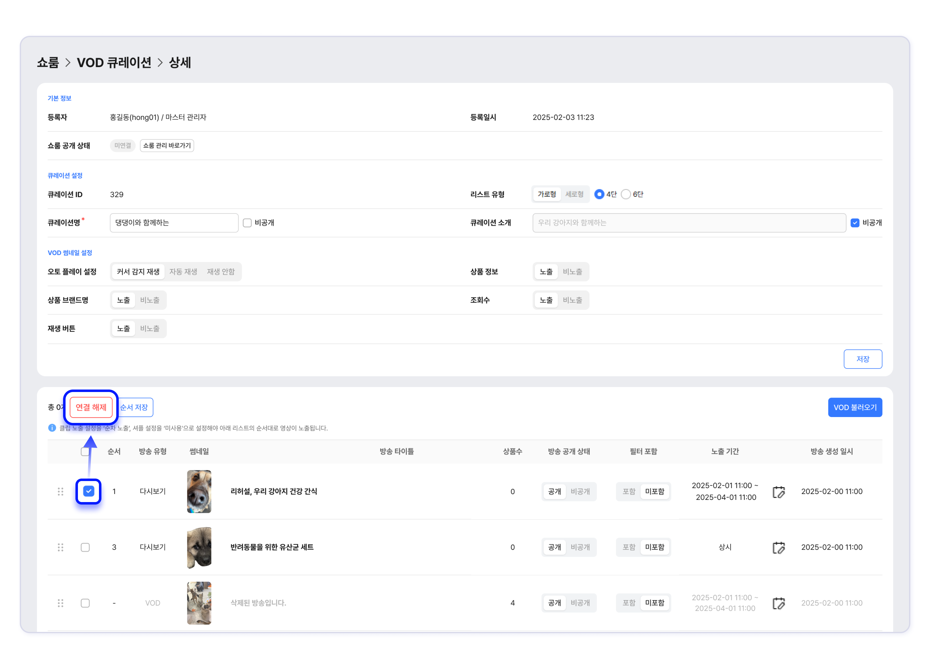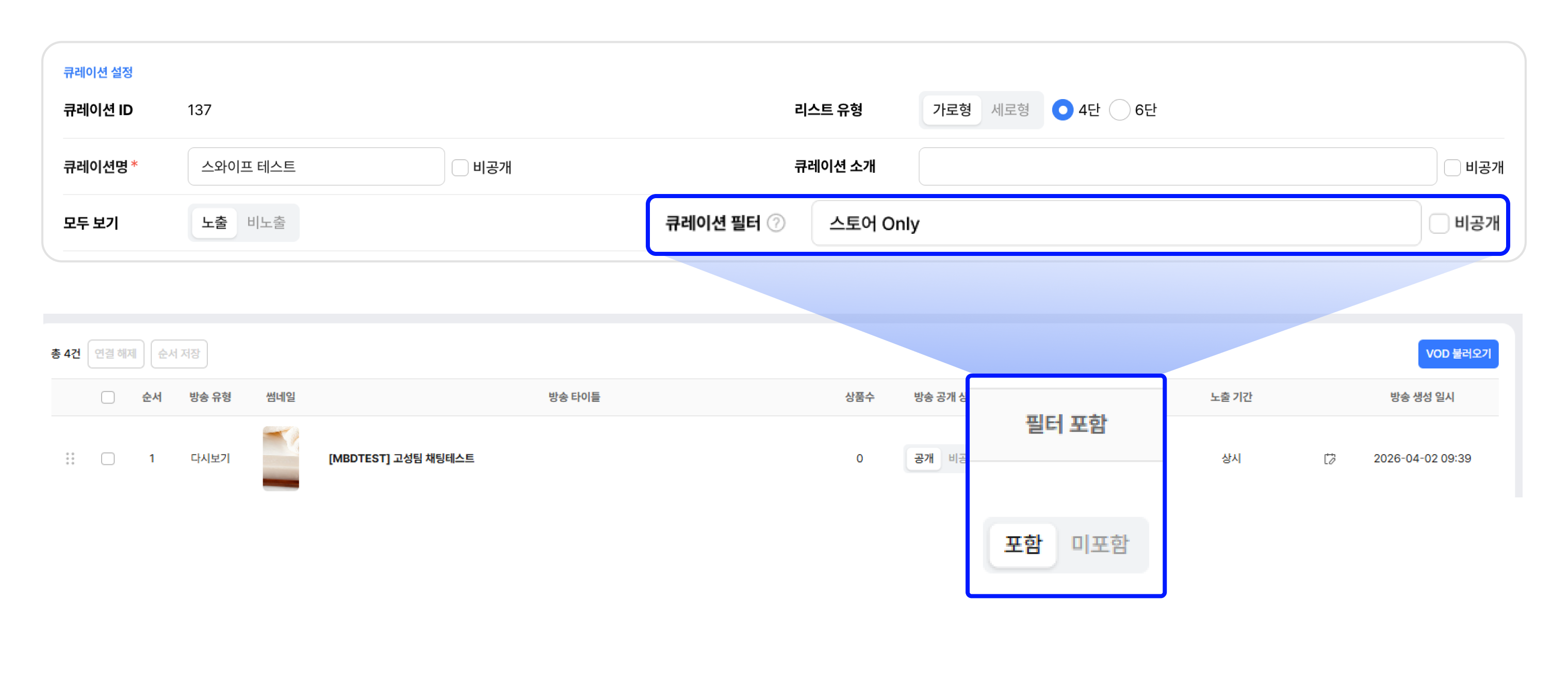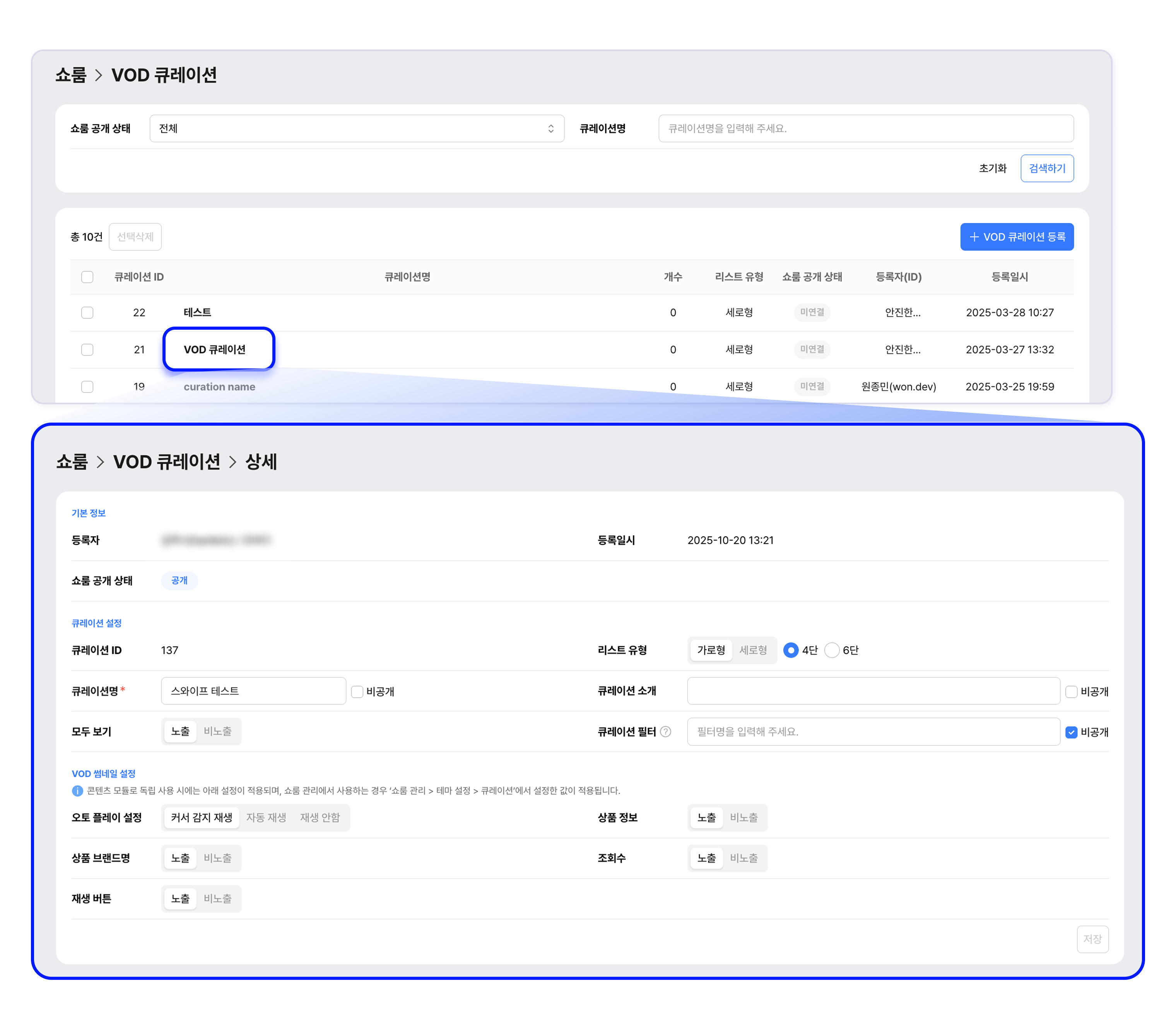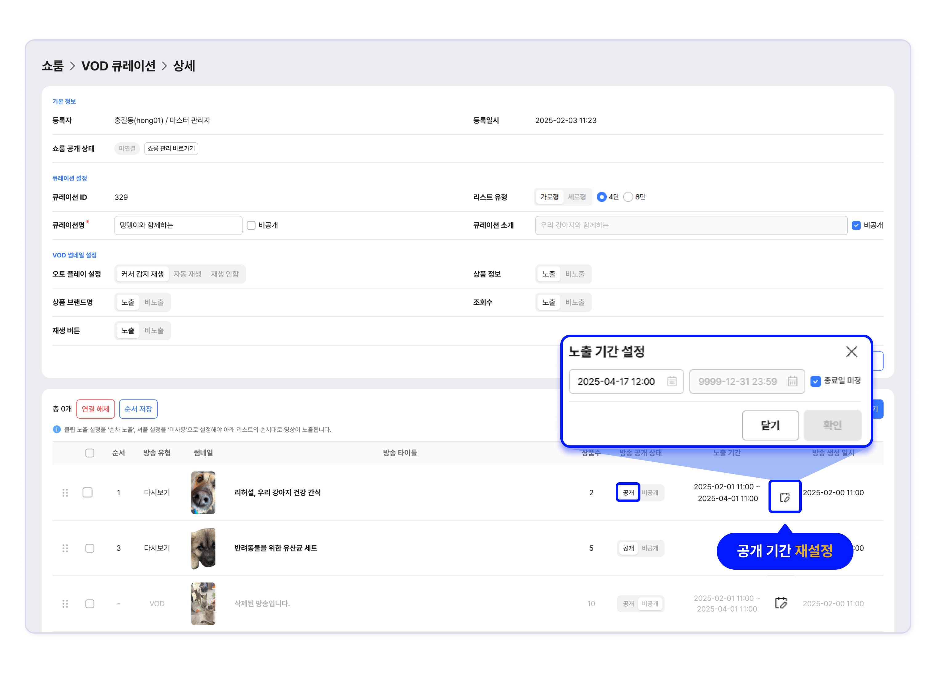 - ์์ฑ๋ VOD ํ๋ ์ด์ ์ ์์ธ ํ์ด์ง์์ ๊ฐ๋ณ VOD ์ฝํ ์ธ ์ถ๊ฐ์ ๋ ธ์ถ ๋ฐฉ์, ํํฐ ์ค์ ๋ฑ ์์ธ ์ค์ ์ด ๊ฐ๋ฅํฉ๋๋ค.