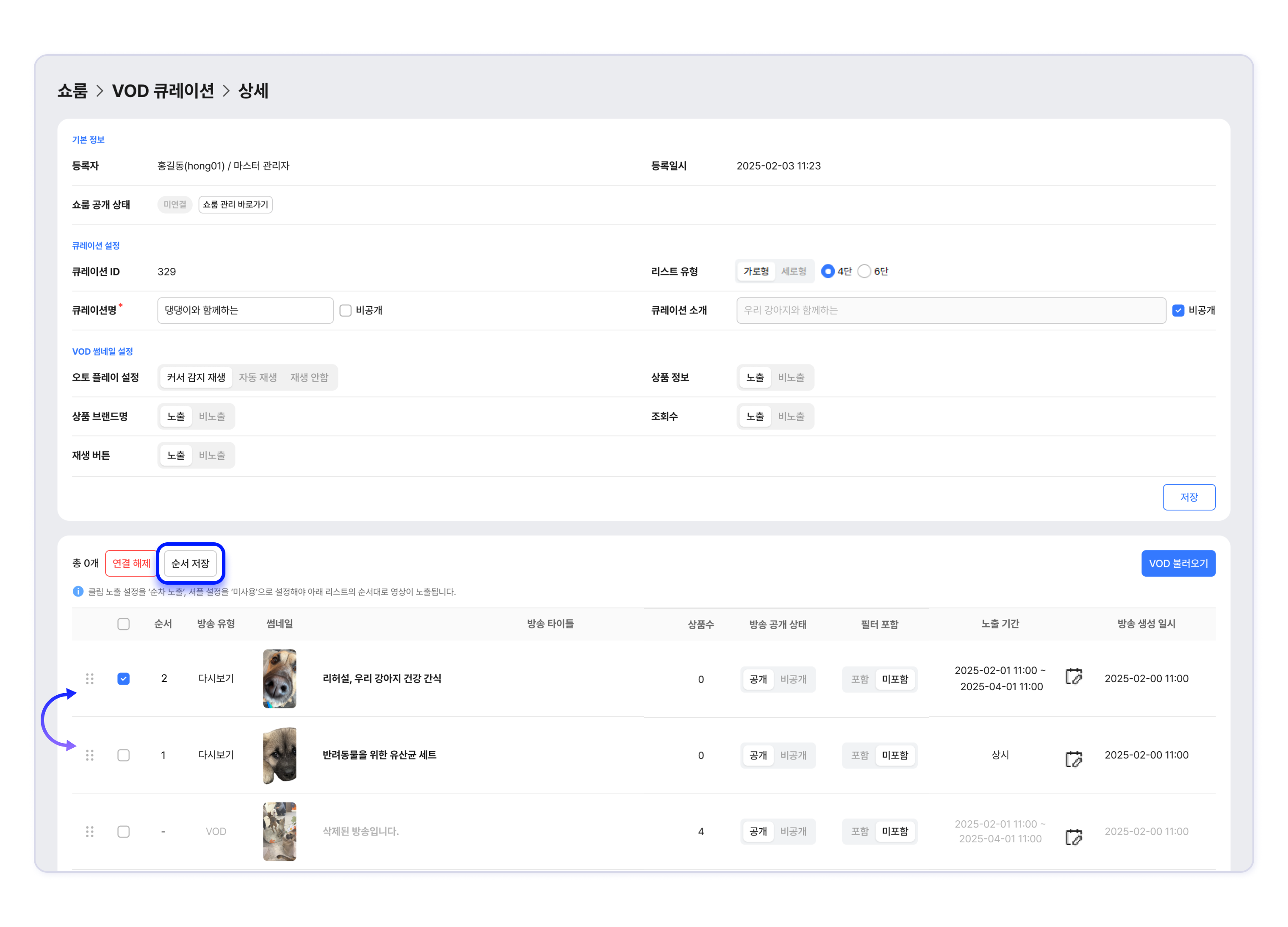 VOD ํ๋ ์ด์ ์์ธ ํ์ด์ง๋ ๊ธฐ๋ณธ ์ ๋ณด, ํ๋ ์ด์ ์ค์ , VOD ์ธ๋ค์ผ ์ค์ ์์ญ๊ณผ VOD ์ฝํ ์ธ ๋ชฉ๋ก์ผ๋ก ๊ตฌ์ฑ๋ฉ๋๋ค.